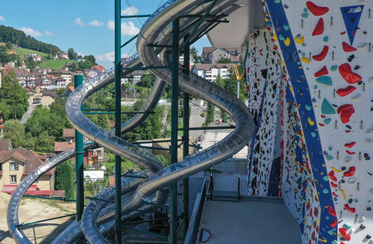 Yvonne Hohl, Betriebsleiterin des Appenzeller Parks, gewährt einen Einblick ins Indoor-Spielparadies, in die Kletterhalle und auf die Rutschbahn. Und besonders Wagenmutige erhalten nach der Besichtigung die Möglichkeit einer 70 Meter langen Rutschpartie vom vierten Stock hinunter ins Kellergeschoss.