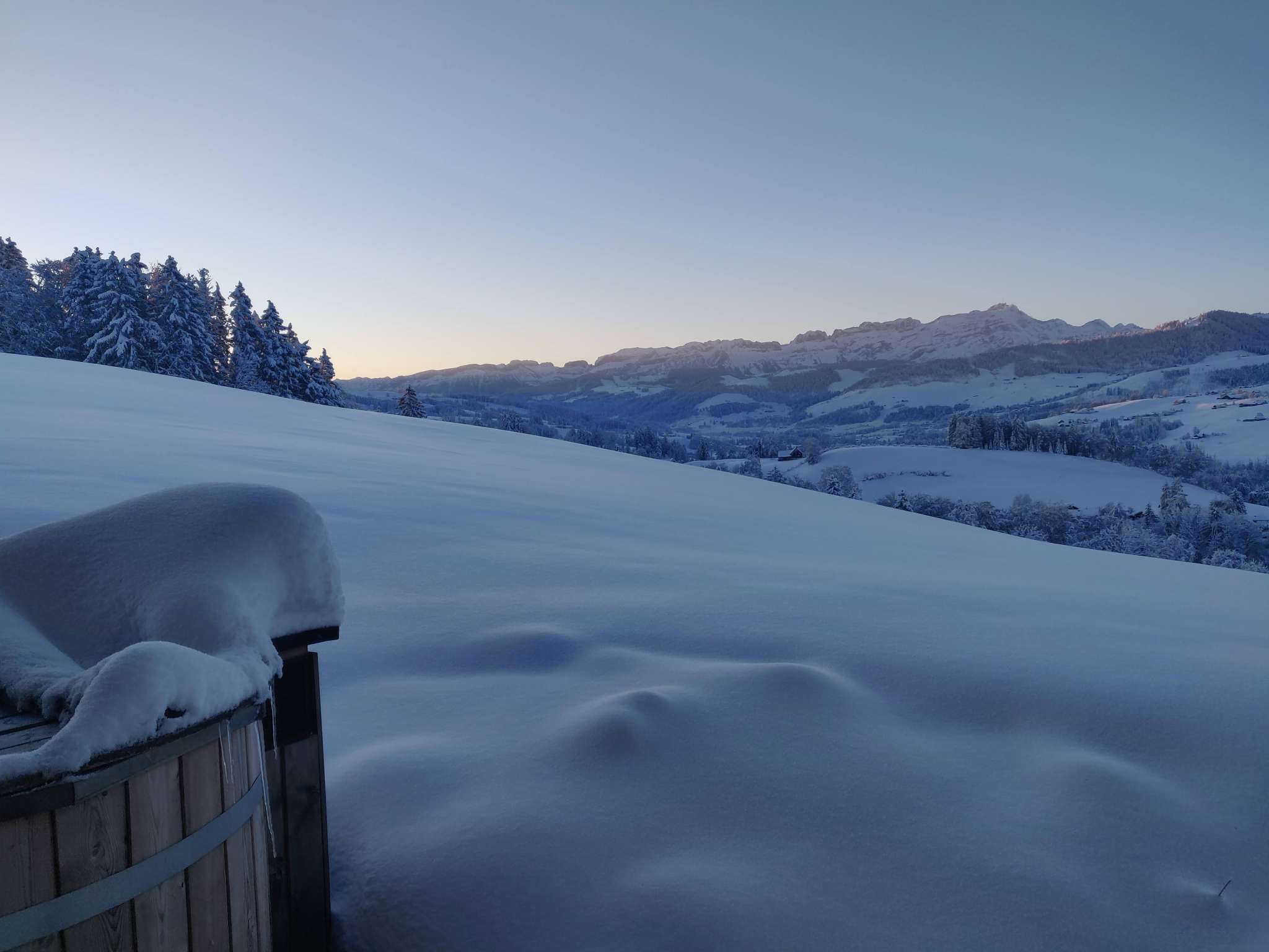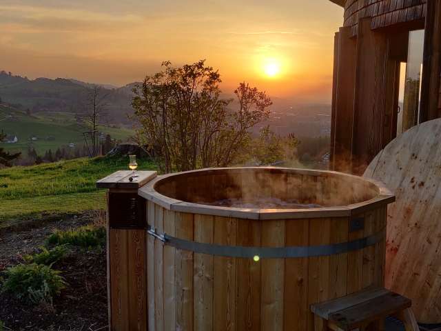 Ausspannen und sich Gutes tun – warum nicht Champagner im Hotpot? Geniessen Sie ein wohliges Sprudelvergnügen auf der Hügelkuppe mit freier Sicht auf den Alpstein.