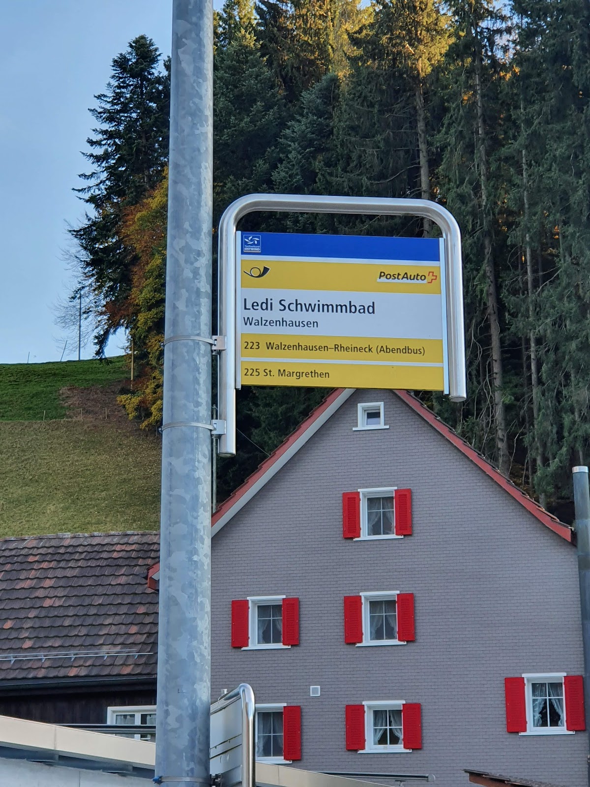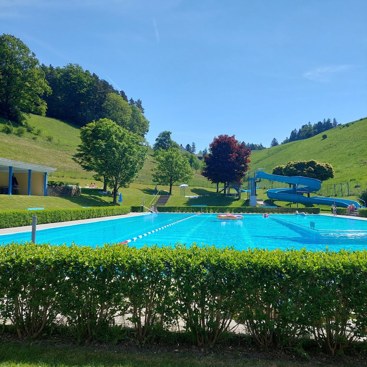 Das kleine Freibad liegt eingebettet zwischen Hügeln und windgeschützt im Weiler Ledi zwischen Lachen und dem Dorf.