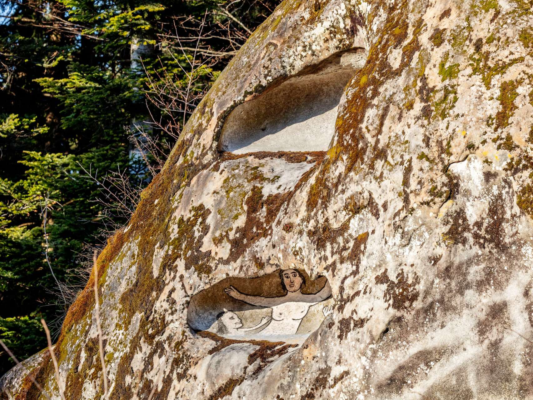 Die Westseite des Sandsteines prägen zwei natürliche Einbuchtungen, in die drei Figuren gemalt sind.