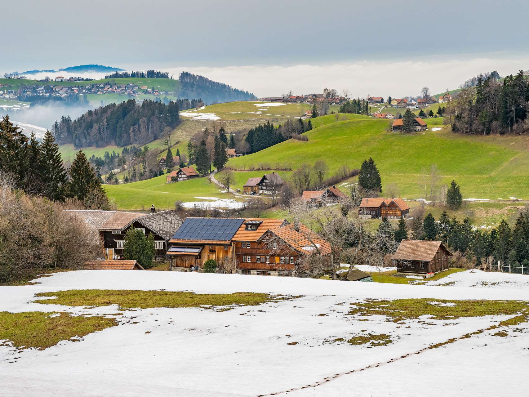 Oben die Hügel des Appenzellerlands und unten die flache Rheinebene – auf der Wanderung von St. Anton hinunter zur Landmark ist die Grenze vom innerrhodischen Bezirk Oberegg zum st. gallischen Altstätten nah. Zurück führt die Route auf Gebiet der Ausserrhoder Gemeinde Wald in einem steten auf und ab durch Wälder und über Wiesen. Auf den Hügeln liegen in der typischen Streusiedlung die Bauernhöfe verteilt.