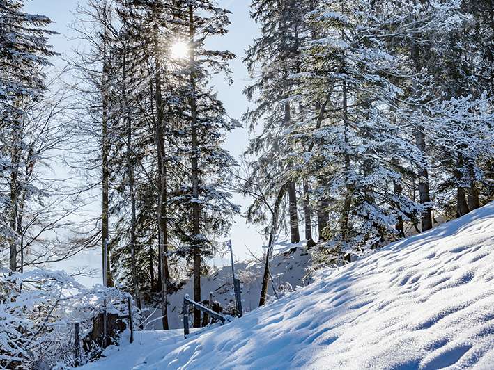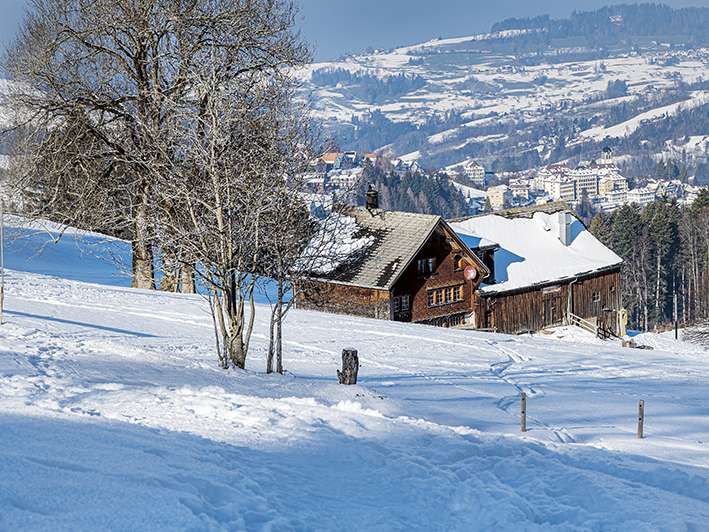 Die Wanderung von Trogen über Neuschwendi und Grosse Säge hinauf auf die Wissegg bringt Aussichten auf Hügel und Dörfer des Appenzeller Mittel- und Vorderlands bis zum Bodensee. Oben angelangt, zeigt sich im Süden der Säntis. Die Route führt mehrheitlich über befestigte Strassen und gepflegte Waldwege – und ist somit auch im Winter gut begehbar.