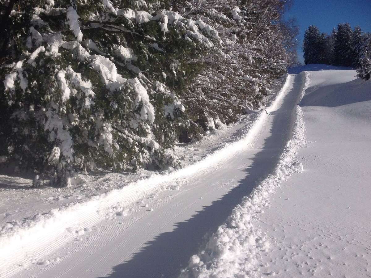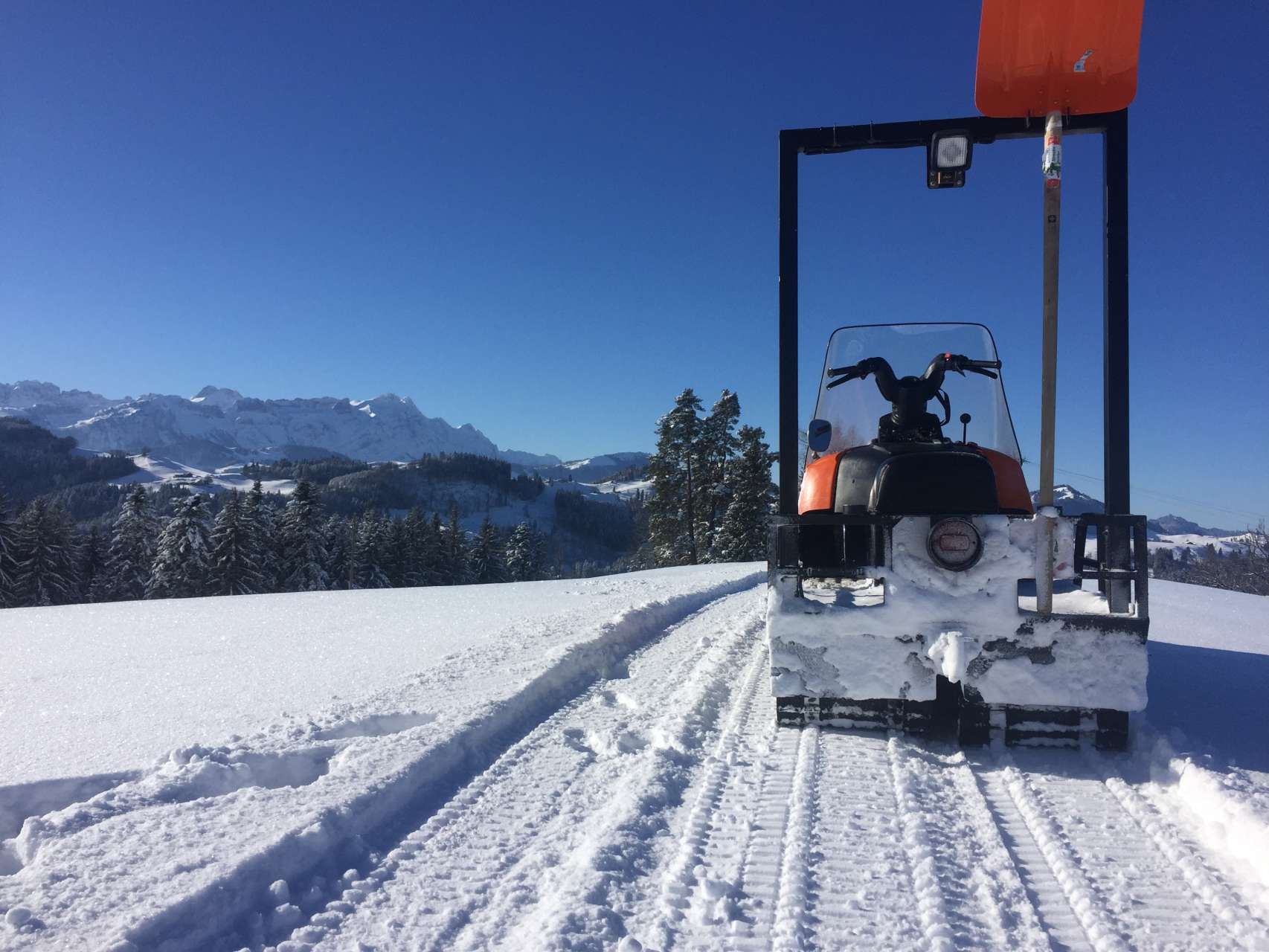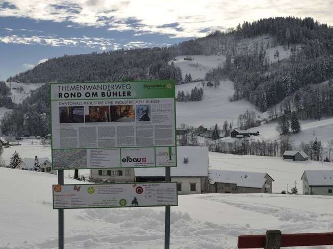 Ein Teilstück der Themenwanderung «Rond om Bühler» ist im Winter präpariert und gut geeignet für Familien. Die insgesamt 12 verschiedenen Informationstafeln vermitteln den Wanderern spannende Fakten über das Dorf Bühler und das Appenzellerland. Die Wanderung startet zentral am Bahnhof Bühler und führt über die Hohe Buche, der höchste Punkt der Wanderung. Die traumhafte Aussicht auf den Alpstein ist eine wahre Belohnung. An schönen Tagen schweift der Blick sogar bis zum Bodensee und den Gipfeln der Innerschweiz. Der Weg führt weiter hinunter zum Weissbach und Kriegersmühle. Von der Kriegersmühle geht es nochmals gemächlich aufwärts bis zur Steinleuten. Von dort aus sieht man den Ausgangspunkt der Wanderung, den Bahnhof Bühler. In wenigen Minuten gelangt man zurück zum Bahnhof Bühler. Der Weg ist von Steigbach / Bühler über Wyssegg zur Hohen Buche präpariert. Die Route ist nicht pink markiert, es hat jedoch separate Tafeln, welche auf den Winterwanderweg hinweisen. Zusätzlich befindet sich am Bahnhof eine Übersichtskarte.