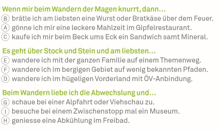 Herzlich willkommen im Appenzellerland! Sie möchten mehr über Ihren Wandertyp erfahren und am Gewinnspiel teilnehmen? Dann füllen Sie die Buchstaben Ihrer gewählten Antworten der Reihe nach in das Code-Feld.