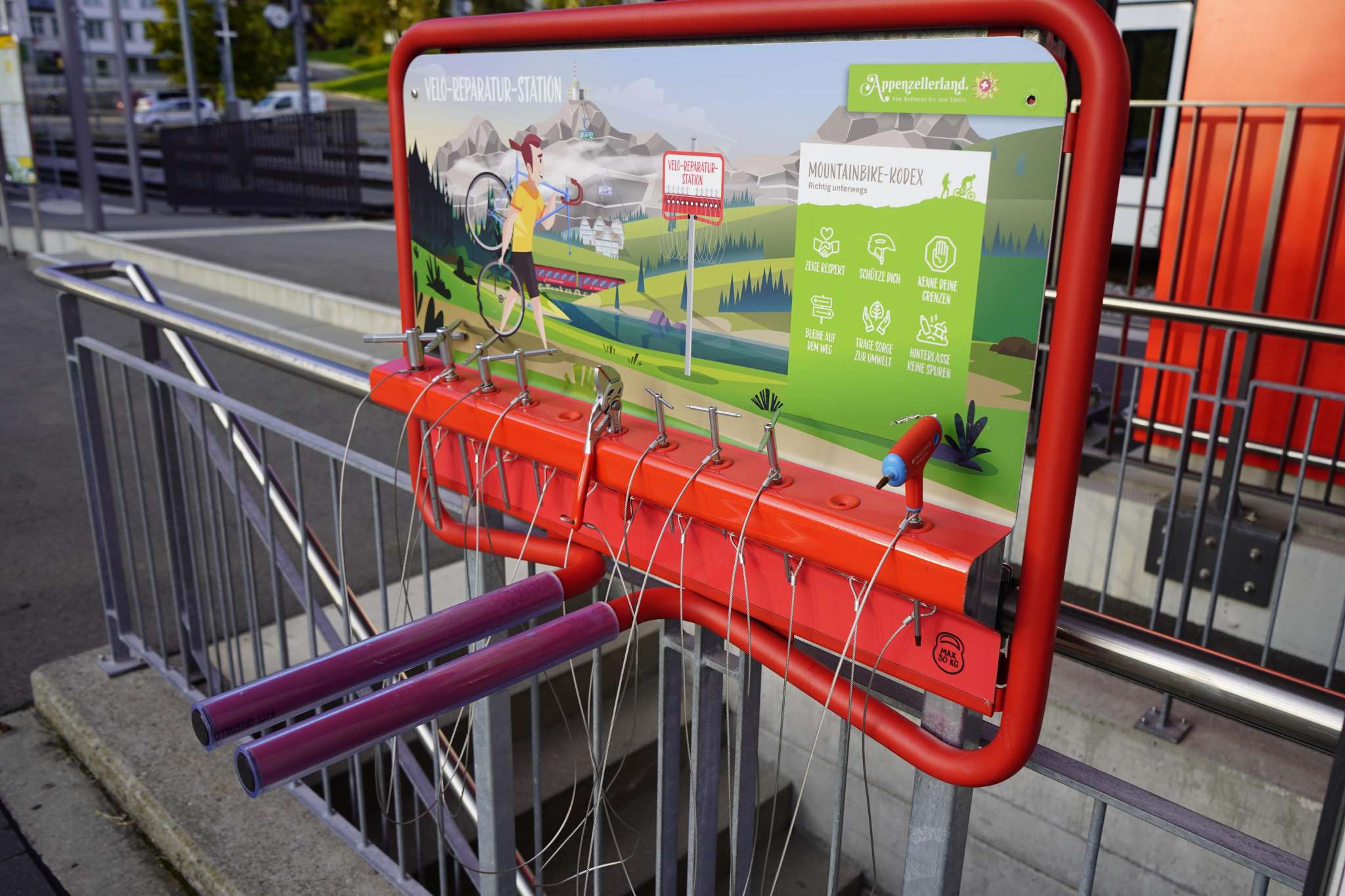 Die Werkzeugstation befindet sich beim Bahnhofplatz am Geländer zur Tiefgarage.