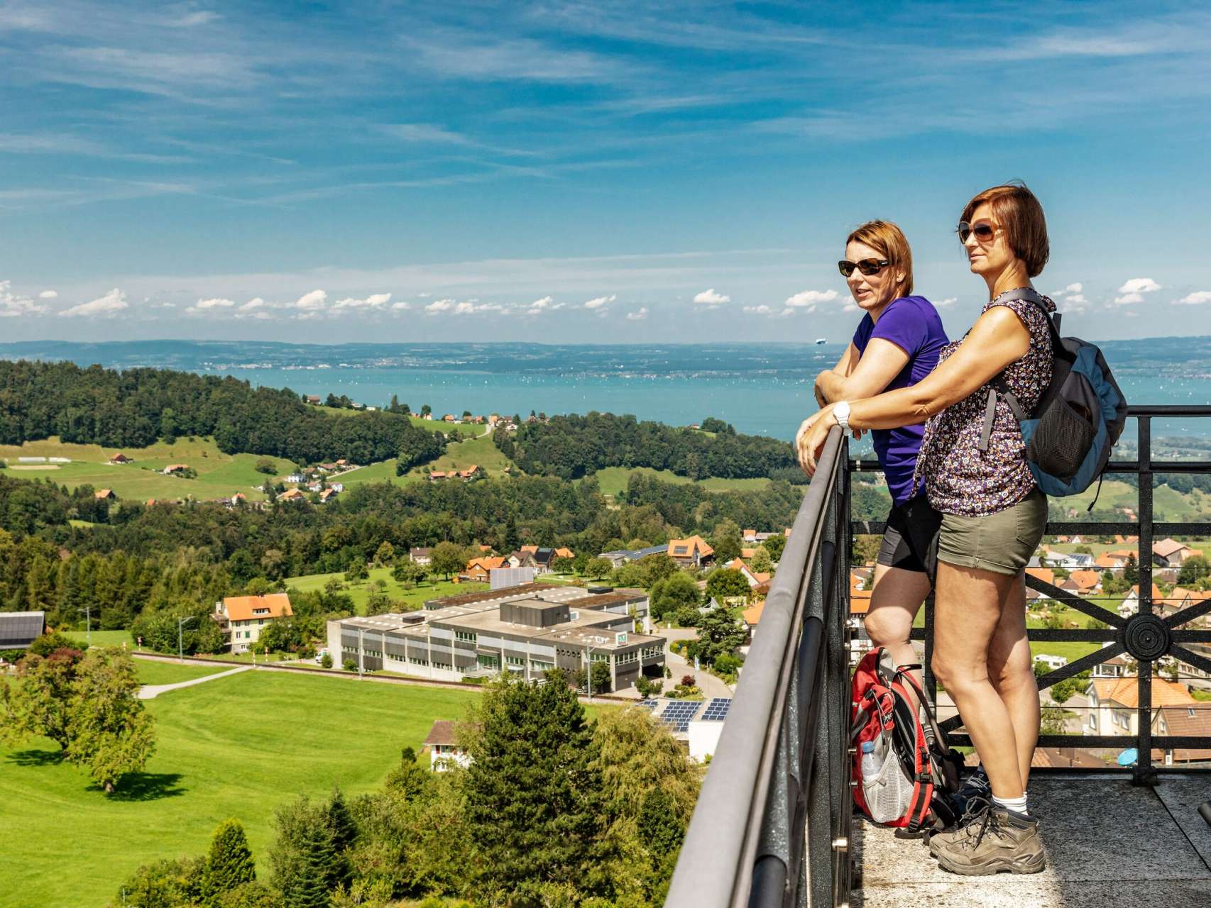 Steigen Sie die 157 Treppenstufen bis ins Turmzimmer hinauf und begeben Sie sich in luftige Höhen. Sie werden mit einem herrlichen Ausblick über den Bodensee und die liebliche Hügellandschaft des Appenzellerlands belohnt.