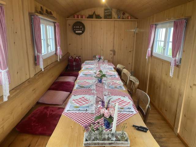 Entspannen und geniessen Sie auf 1'100 Meter über Meer, inmitten traumhafter Kulisse mit Panoramasicht auf den Säntis und Alpstein. Der Hotpot bietet für Sie das Richtige, egal ob sie ein romantisches Badeerlebnis bei Sonnenuntergang oder einen freudigen Badespass in gemütlicher Runde planen. Die Aussicht ist grandios. Nichts versperrt den Blick auf den Alpstein. Vor Ihnen liegen Kronberg und Säntis. Im gemütlich eingerichteten Wagen direkt neben dem Hotpot servieren wir Ihnen gerne etwas Feines aus unserer regionalen Küche.