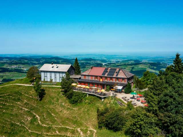 Der Aufstieg auf die Hundwiler Höhe lohnt sich immer. Dafür sprechen die grandiose Rundumsicht auf Alpstein und Bodensee und die gemütliche Atmosphäre im auf 1295 Meter über Meer liegenden Berggasthaus. Sie lassen den Besuch zu einem unvergesslichen Erlebnis werden. In der Gaststube ist man selten allein. Auf der Karte stehen einfache, bodenständige Gerichte. Chäshörnli und Gerstensuppe sind die Klassiker. Auf Bestellung gibt es auch verschiedene andere Menus. «Chrömli» versüssen den Aufenthalt. Das Berggasthaus ist das ganze Jahr von Dienstag bis Sonntag geöffnet. Montags ist Ruhetag.