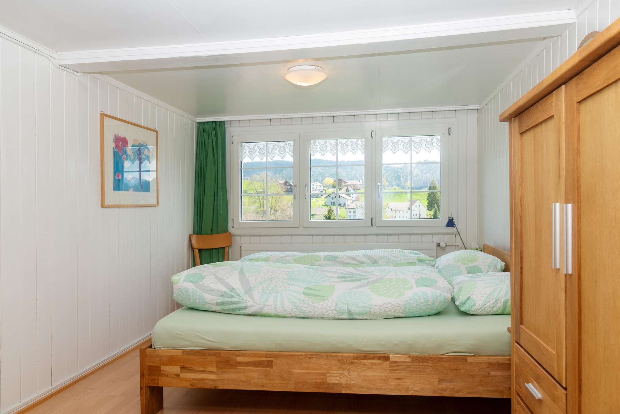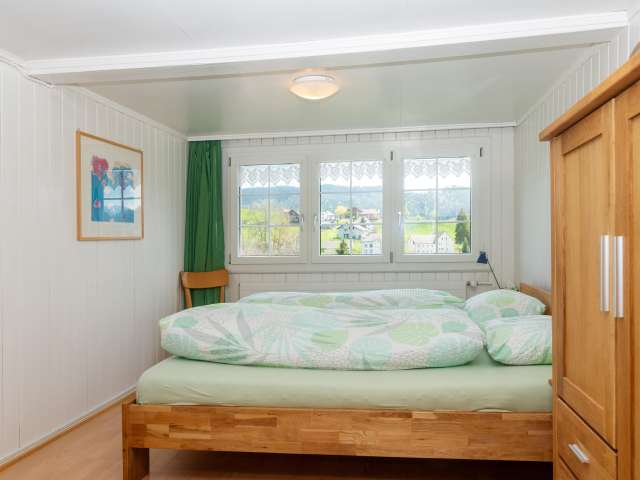 2 Schlafzimmer (1 Doppelbett, 1 Einzelbett), kleine Stube, separater Eingang, Gartenterrasse zur Mitbenützung. (Auf Anfrage ist im Estrich ein Zimmer mit zwei zusätzlichen Betten verfügbar)
