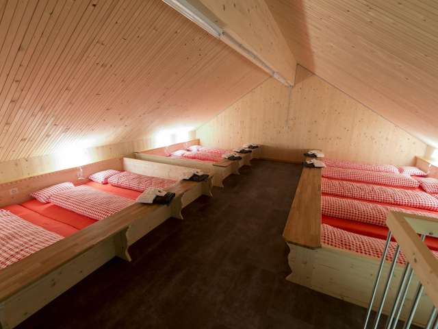 Das Matratzenlager bietet Platz für 12 Schlafplätze. Alle Betten sind mit Duvet bezogen. Im Parterre befindet sich eine Dusche mit WC. Zusätzlich steht für die Gäste ein Kühlschrank mit einer kleinen Auswahl an Getränken zur Verfügung. Ein traditionelles Holzbuffet und eine Sitzecke mit Tisch runden die heimelige Unterkunft ab.