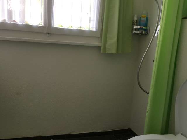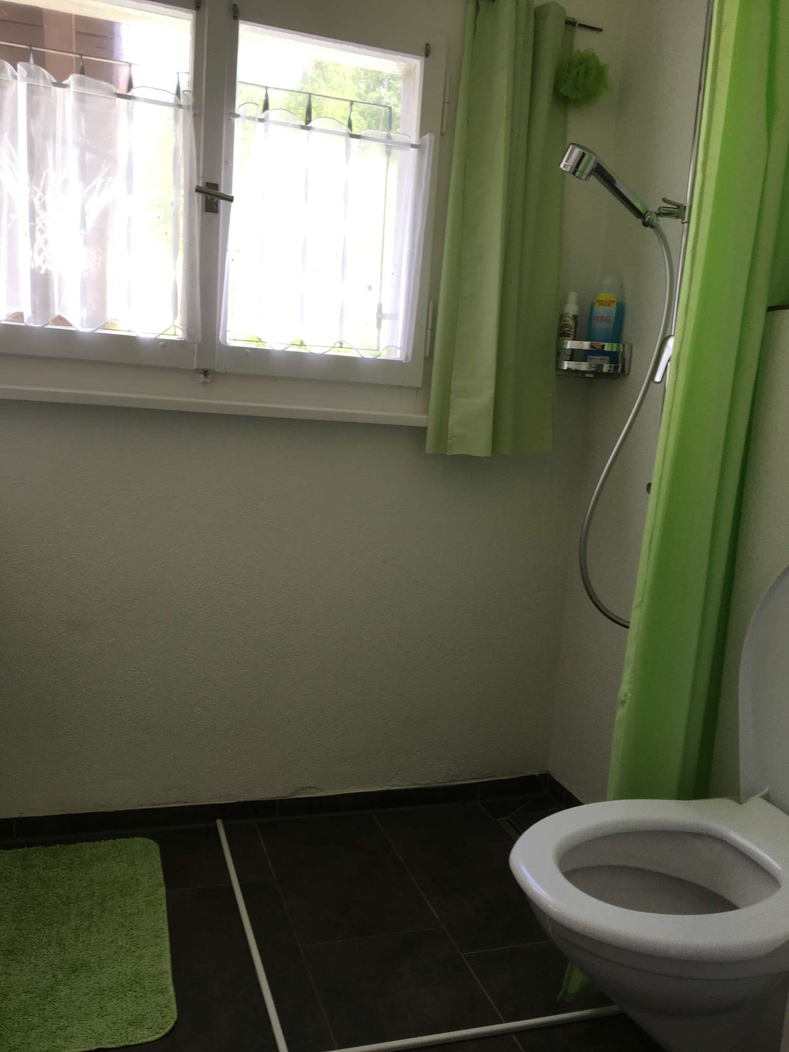 Im Erdgeschoss befinden sich das Badezimmer mit Dusche, WC und Waschtisch, eine kleine Küche ohne Essmöglichkeit, mit Kühlschrank und Eisfach, elektr. 2-Plattenherd mit Dampfabzug, Backofen und Kaffeemaschine (Delizio), ein Wohnraum mit ausziehbarem Esstisch für 8 Personen, Bettsofa für zwei Personen. Cheminée und regulierbare Bodenheizung.