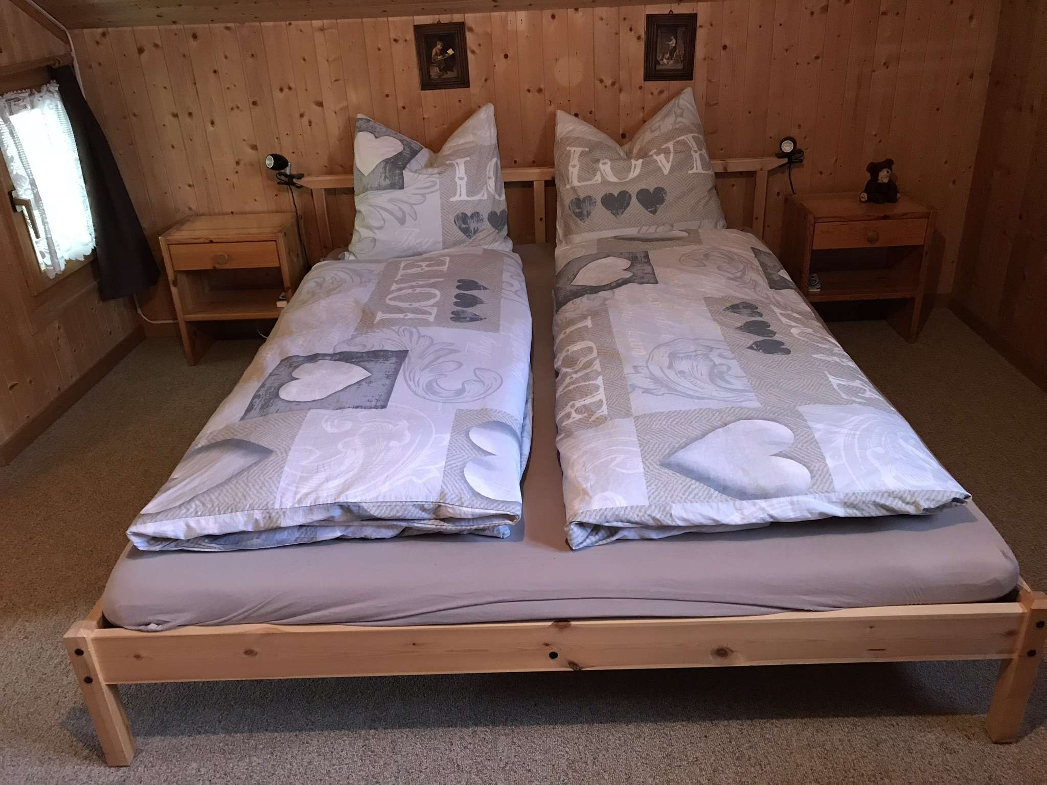 Über eine Holztreppe im Wohnzimmer gelangt man im Obergeschoss zu den zwei romantischen Schlafzimmern mit je einem Doppelbett und je einem Einzelbett.