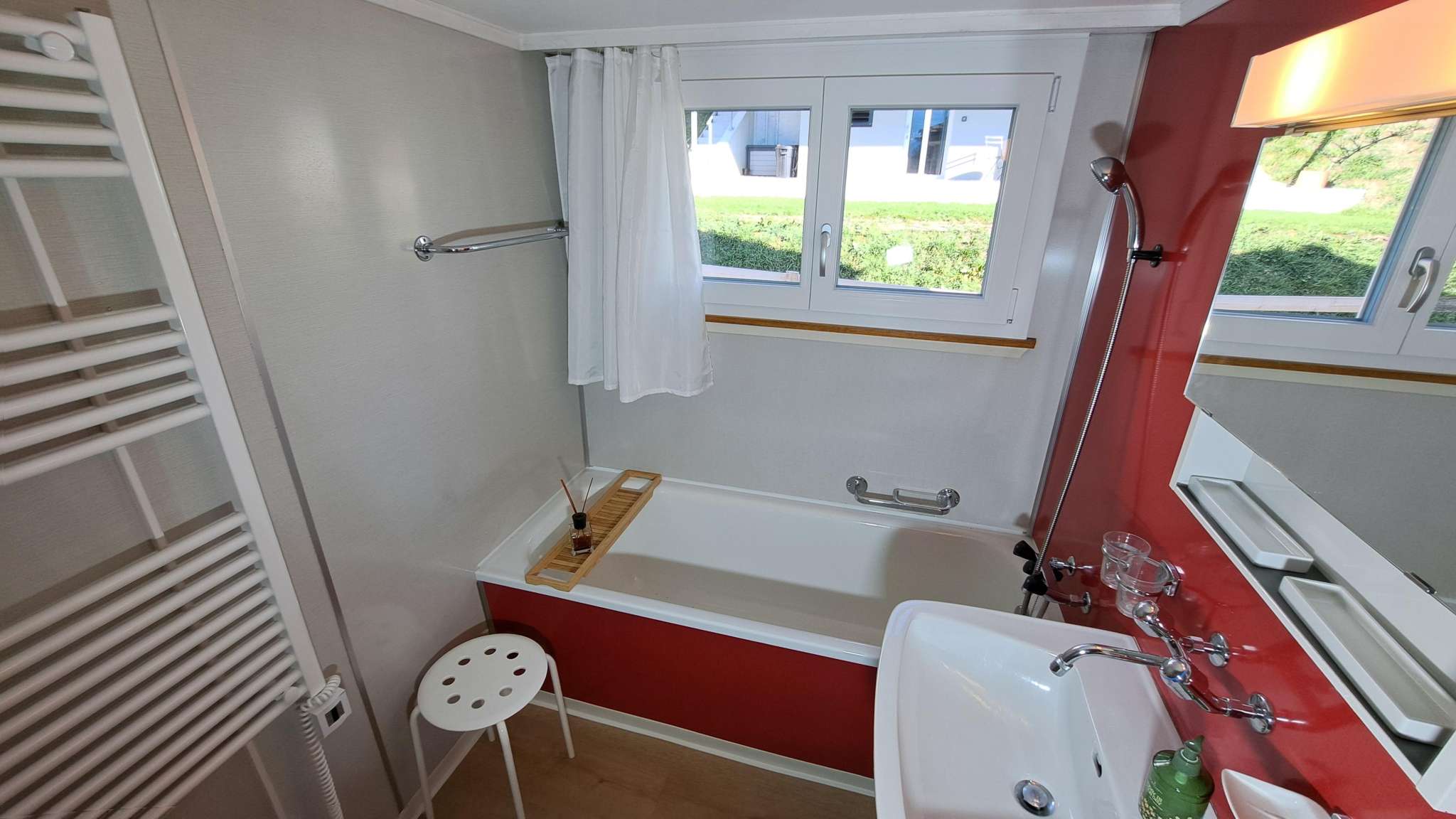 Das Bad beinhaltet Badewanne, separate Dusche, Lavabo, Handtuchwärmer, Fön und Frottéewäsche. Das WC ist separat. Das Haus kann mit einem ölbefeuerten Kachelofen und individuellen Elektro-Heizkörpern beheizt werden.