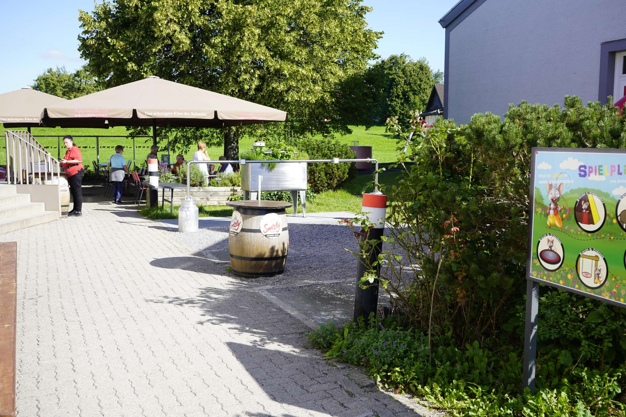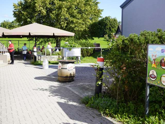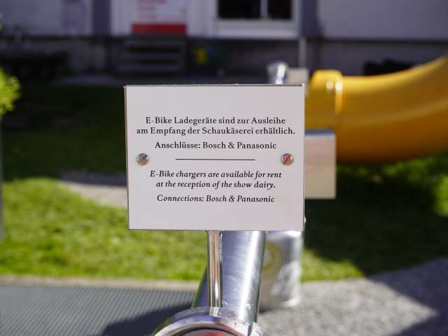 Der Ständer befindet sich direkt neben dem Eingang zum Shop/Restaurant. Am Empfang der Schaukäserei können Ladegeräte für die Marken Bosch und Panasonic ausgeliehen werden.
