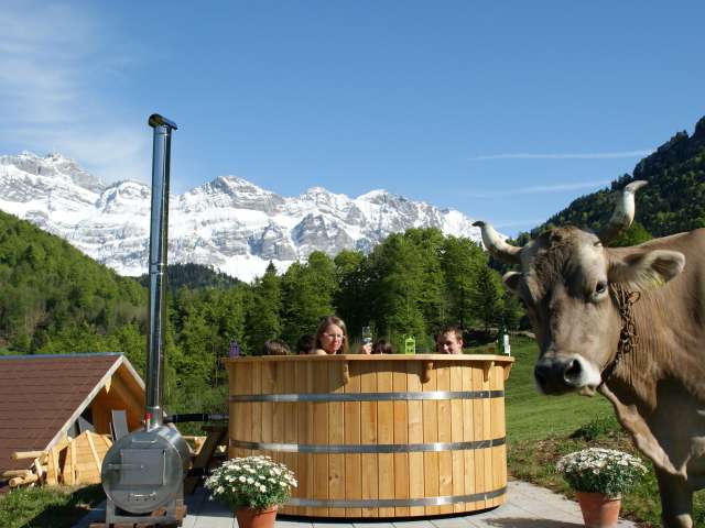 Geniessen Sie in der freien Natur unter dem Sternenhimmel ein Bad in unserem Hot-Pot mit Blick auf den Säntis.