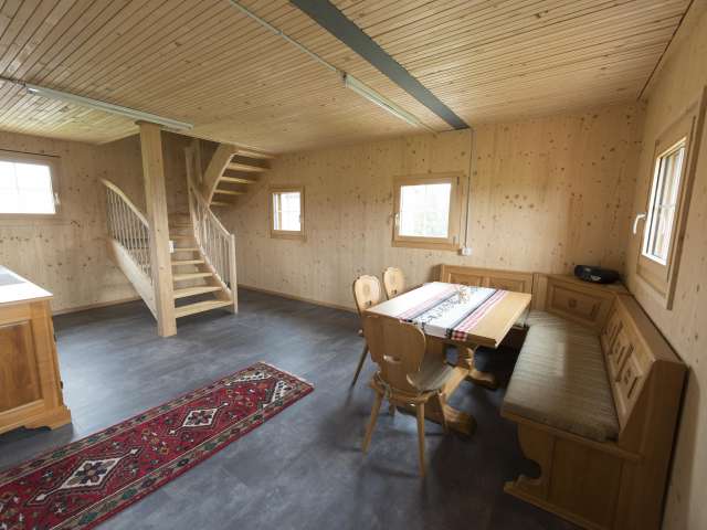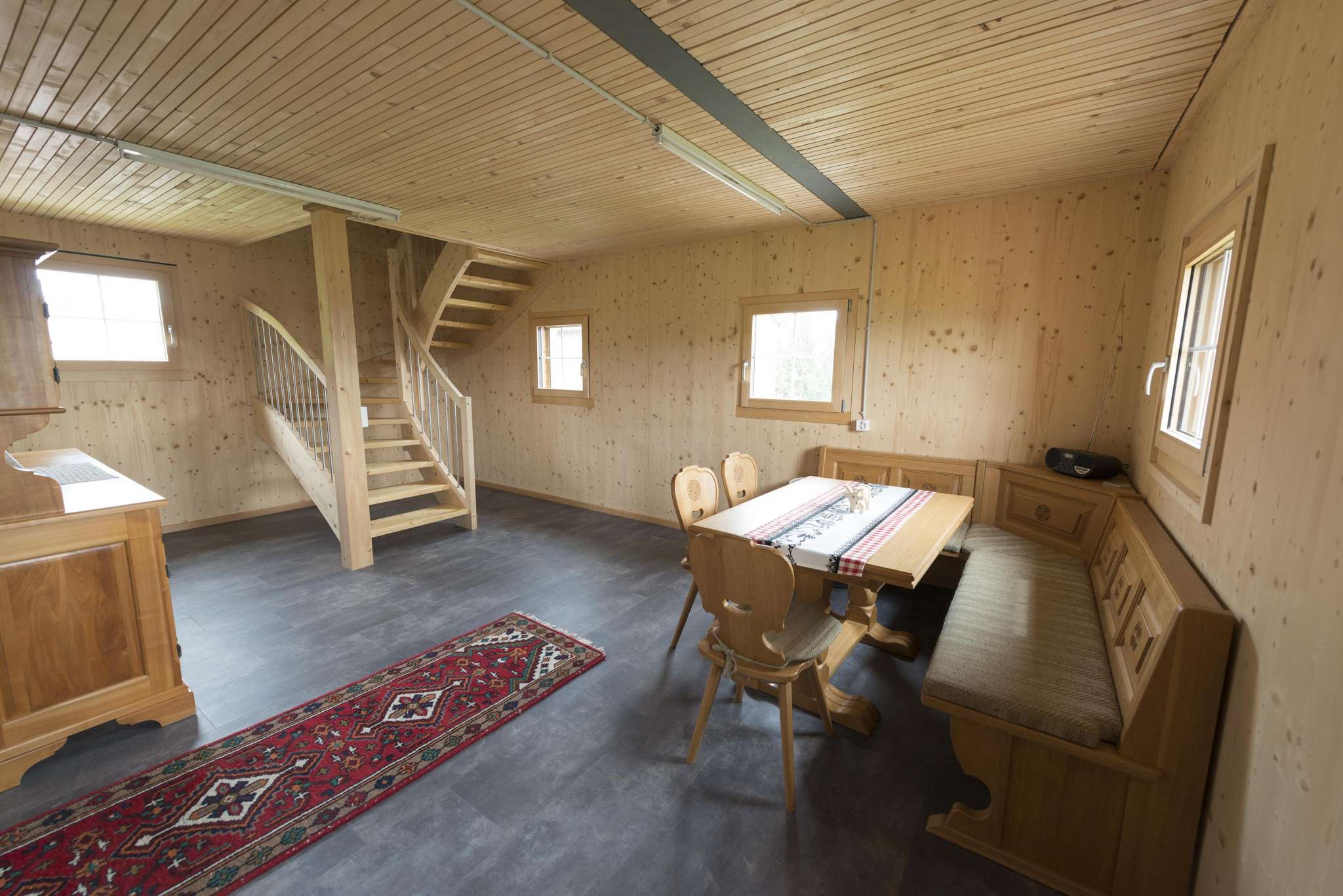 Das Matratzenlager bietet Platz für 12 Schlafplätze. Alle Betten sind mit Duvet bezogen. Im Parterre befindet sich eine Dusche mit WC. Zusätzlich steht für die Gäste ein Kühlschrank mit einer kleinen Auswahl an Getränken zur Verfügung. Ein traditionelles Holzbuffet und eine Sitzecke mit Tisch runden die heimelige Unterkunft ab.