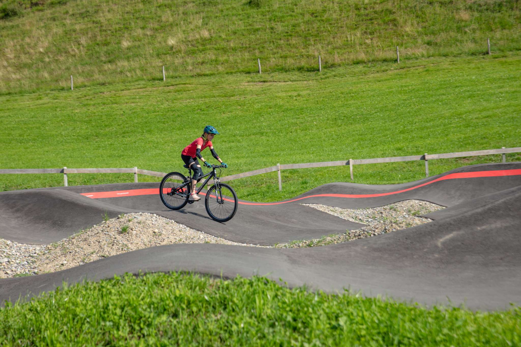 Riding a bike on a pump track means experiencing the pure joy of motion on a seemingly endless track. Riders need to actively adapt to the course with its waves, bends and jumps through swift up and downwards motions, «pumping» and generating speed without pedalling or pushing.
