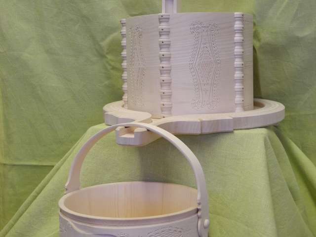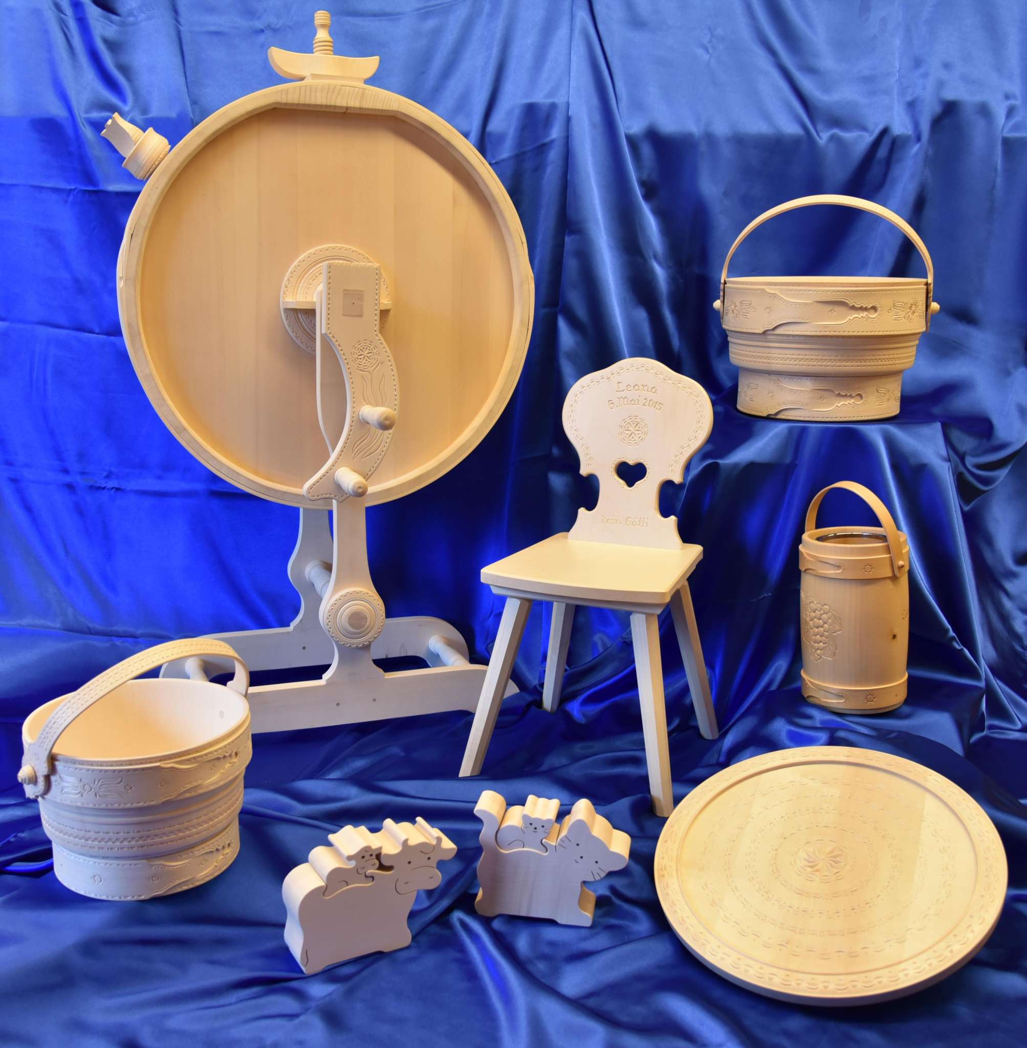 White cooperage is a traditional craft practised in farming communities. Nowadays, many everyday objects are made of aluminium and chrome steel, but wooden utensils and receptacles are still used on alpine farmsteads. A wagon loaded with these items traditionally forms part of the cattle drive down from the mountain pastures.