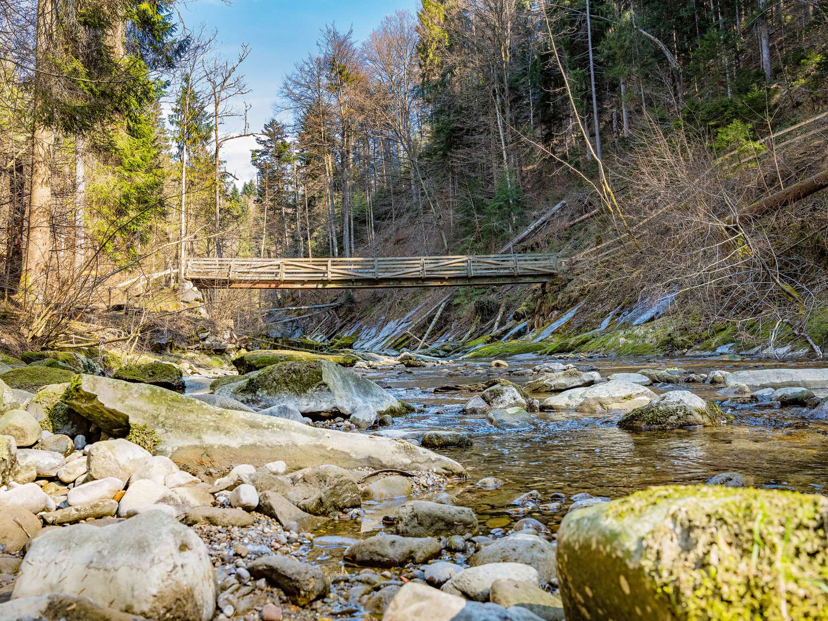 The hike from Niederteufen to Haslen passes through both the Outer and Inner Rhodes; the Rotbach and the walls of the Wonnenstein Monastery mark the border between the cantons. The Rotbachtobel, a wild ravine, is crossed twice on the route. And in a short distance, four times 80 metres of ascent are covered. Impressive views of the rocky river landscape are the reward for this effort.