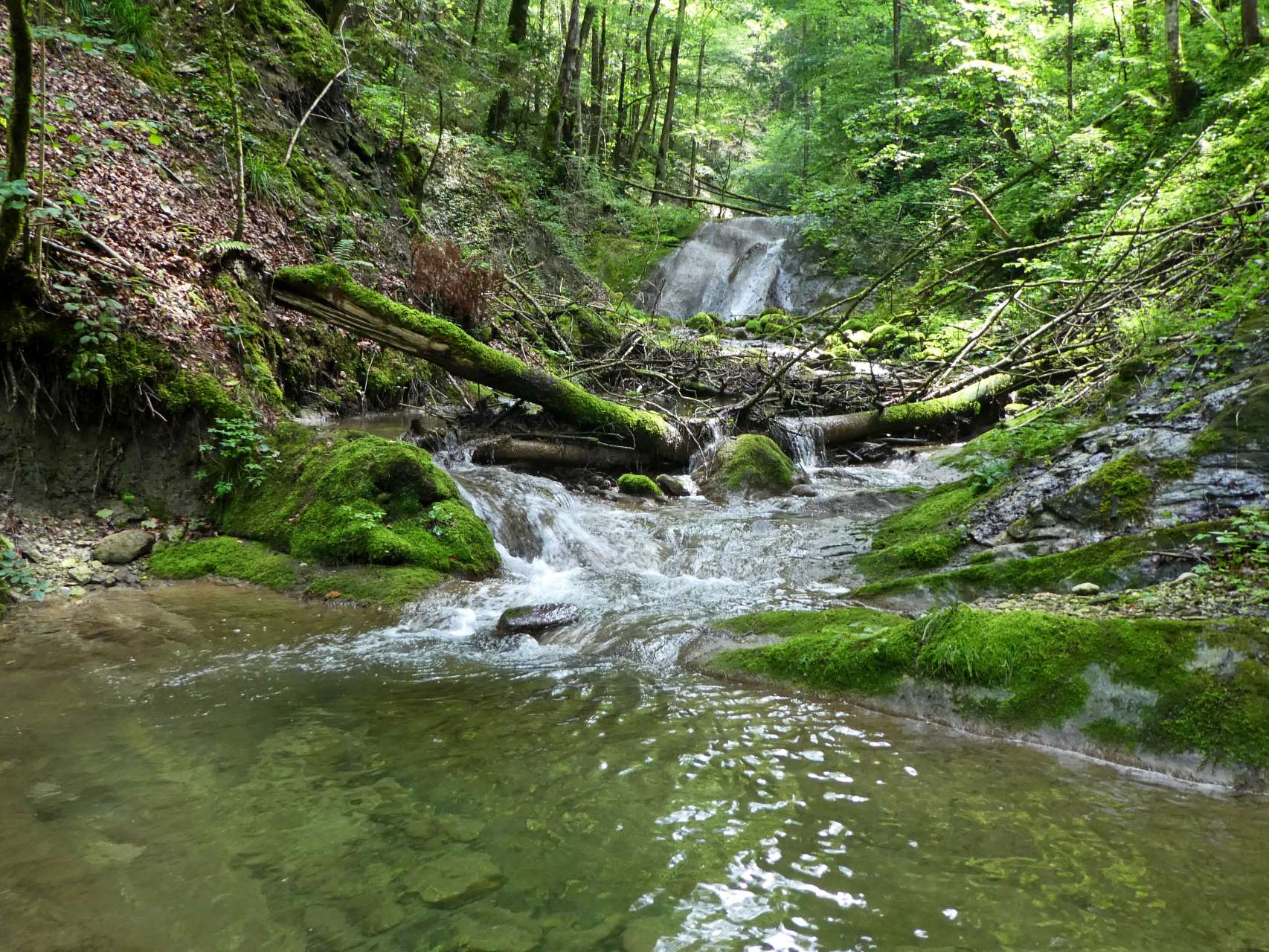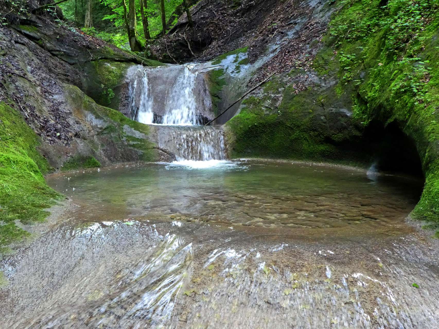 The Mühlebach is a small tributary to the Urnäsch and the Hundwilertobel. In the upper part you balance loosely over stones and through gullies. In the middle section, the thresholds become higher and the waterfalls and bathing pools accumulate. If you don't want to slip over the slippery rocks, you have to bring a rope and "abseil" down with it. But the many beautiful pools always invite you to jump in and cool off.