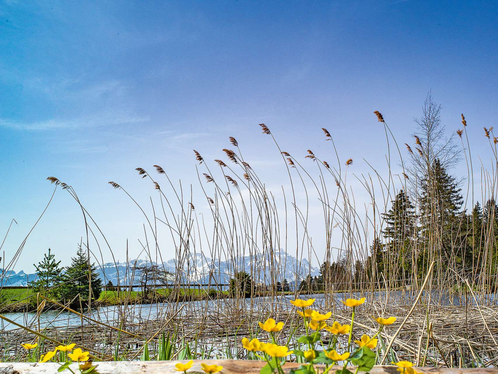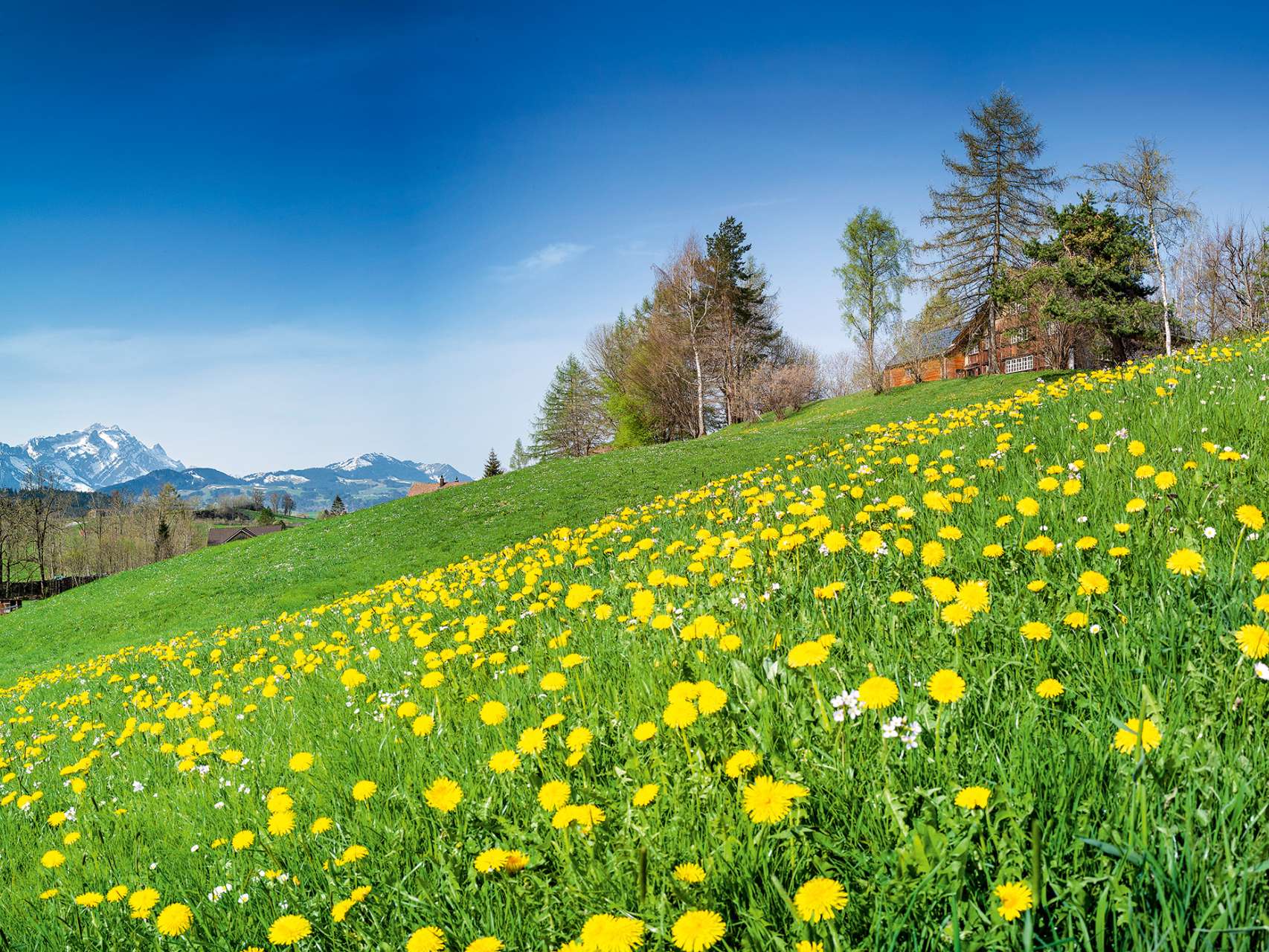 Nature has woken up, showing lush green grass, bright yellow flowers and pale pink buds. The diverse route takes the hiker east of Gais village across gravel paths, small asphalt roads, rooty forest paths, soft earth and moist reed soil. And the views from the Schwäbrig and Sommersberg mountains are fantastic. They reach from the Alpstein massif in the south via the Rhine Valley and the Vorarlberg region in the east to Lake Constance in the north.