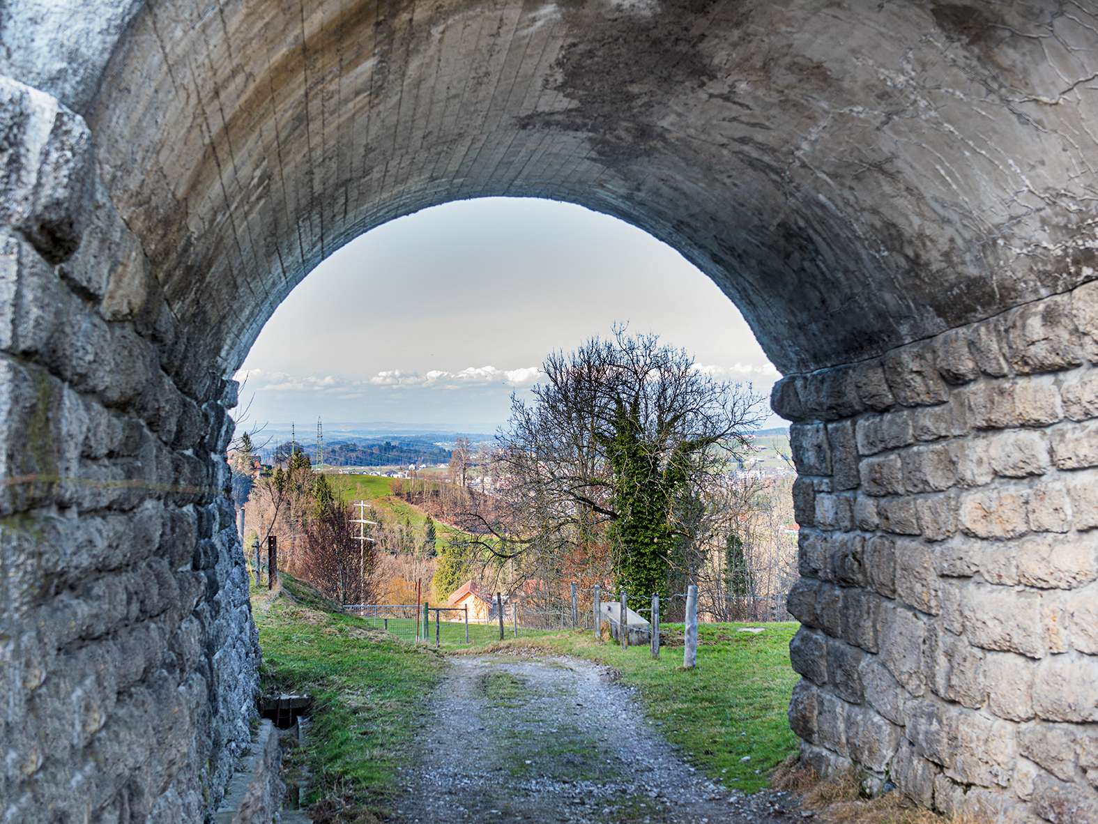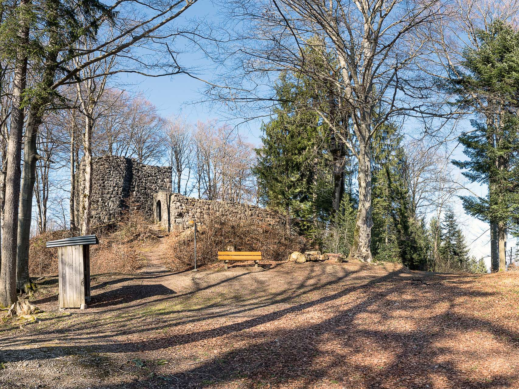 Rosenburg Castle, the destination of this walk, is situated at the top, at the edge of Ramsenburg forest. The ascent is steep. At the end, an ancient building from the 12th century awaits as a reward. It was built when the knights of Rorschach held sway over Herisau. The hike up to Ramsenstock mountain also offers spectacular views – across the Fürstenland to Lake Constance and over the Appenzell hills to Mount Säntis. The records mention Rosenburg Castle for the first time in 1270. Initially, it served to protect against attacks, and later on it functioned more like a manor house. In 1396, Rosenburg Castle was sold to St. Gallen Abbey and in 1403, during the Appenzell War, it was destroyed. In the 1930s, the remains of the castle were excavated and conserved. The remains of the tower house and another residential building can still be identified. And a deep well has been preserved in the courtyard. The buildings are surrounded by a moat and a ring wall that are clearly visible.