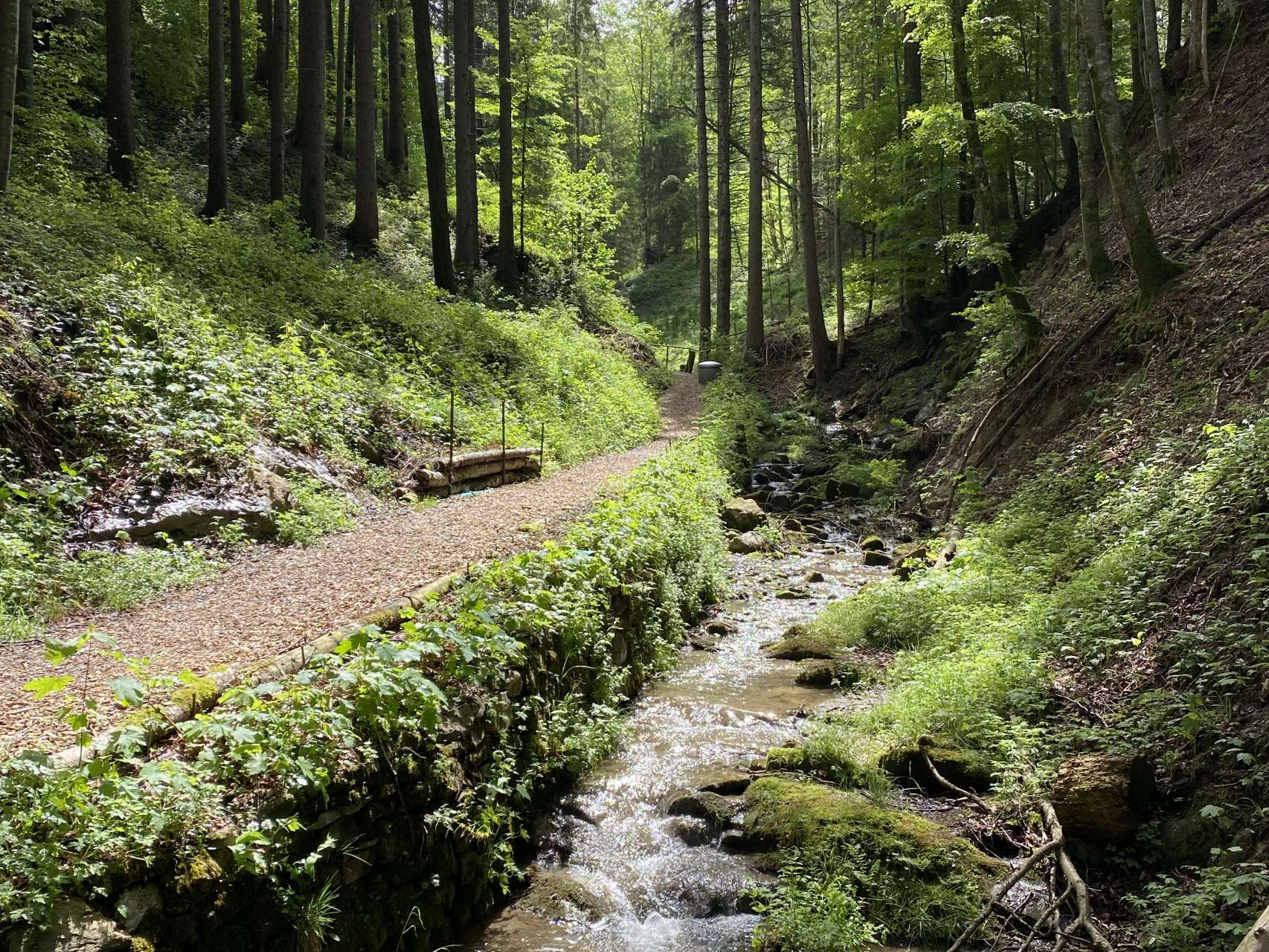 From the Örtlismühle treatment plant, along the meadows and through forests you walk on the idyllic “Siebebröggliweg”, taking in the stations of the water trail. On a 1.5-km stretch, 13 panels depict interesting details on the subject of water.