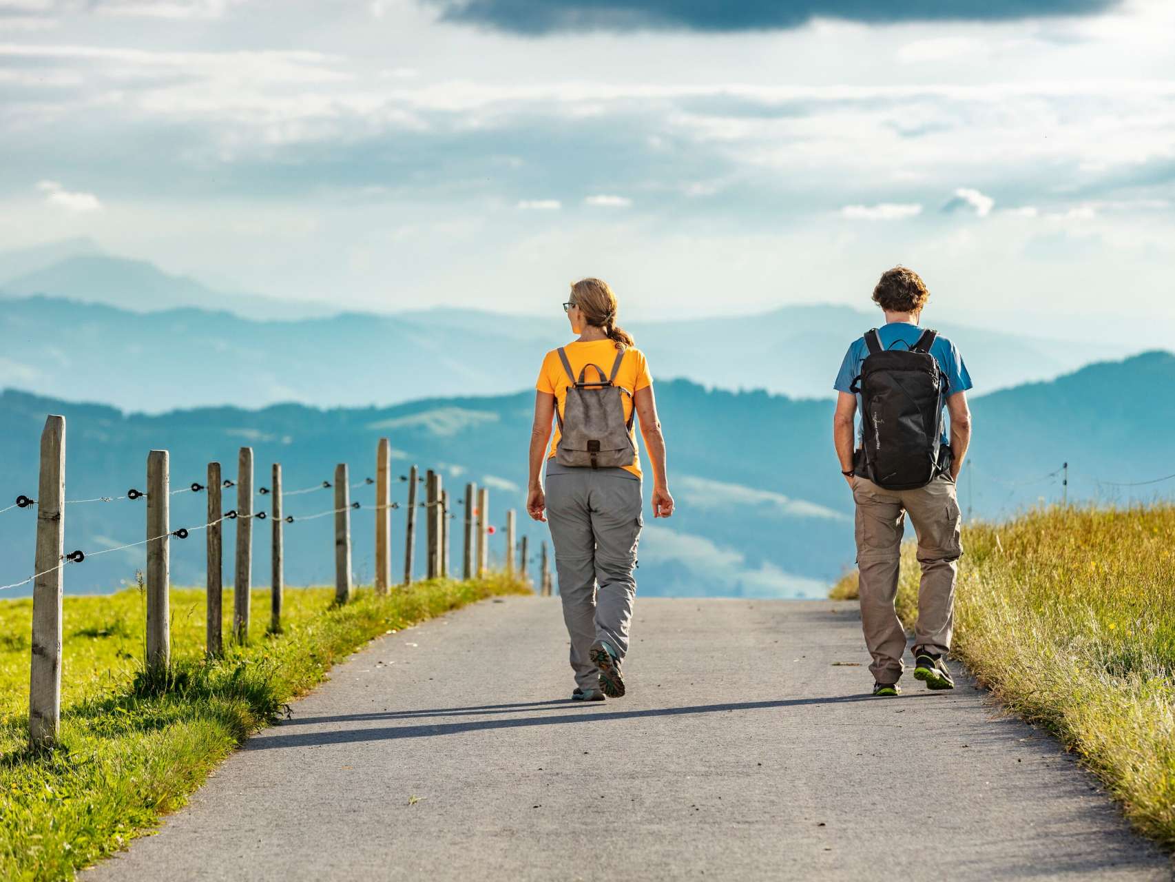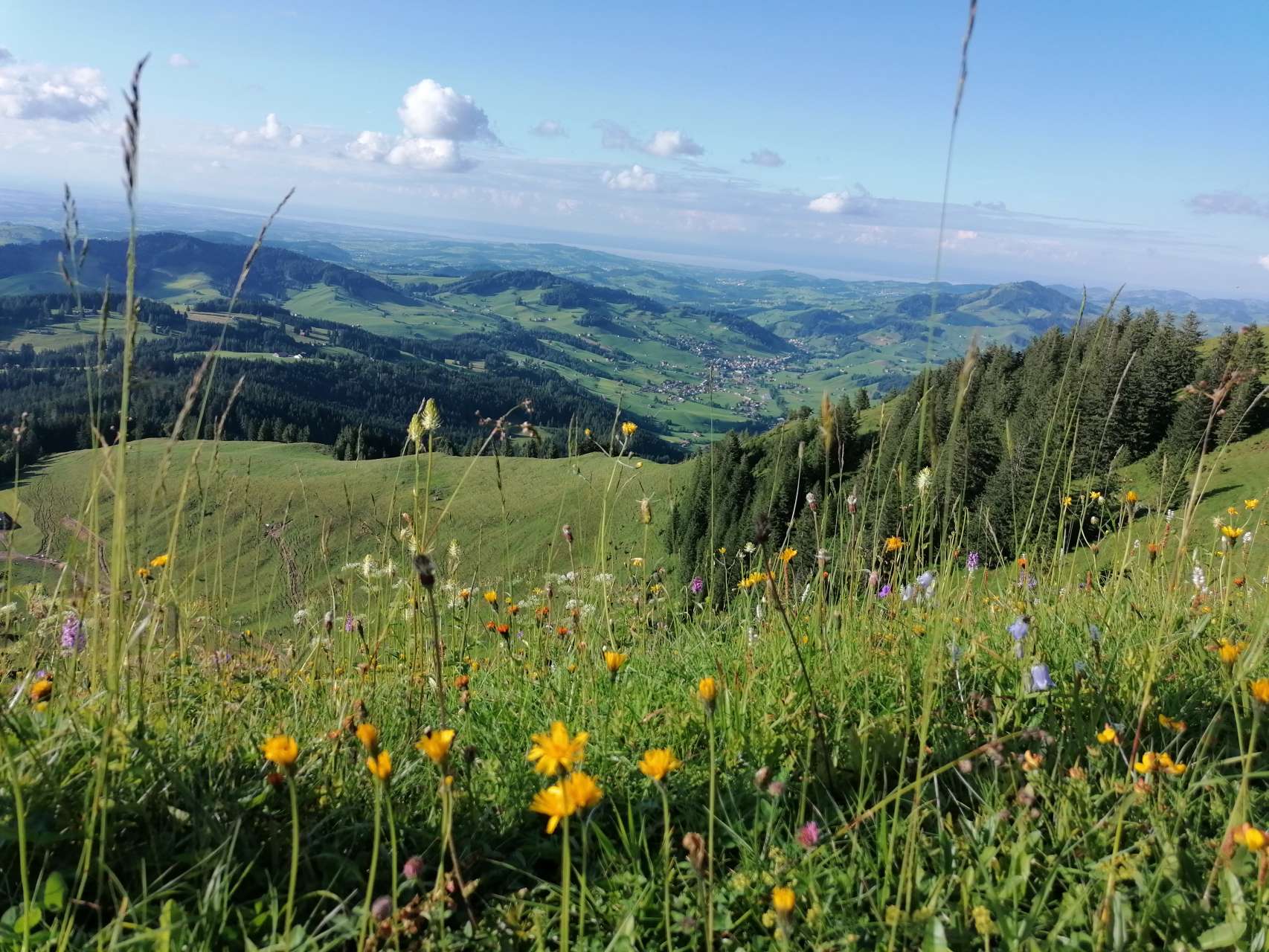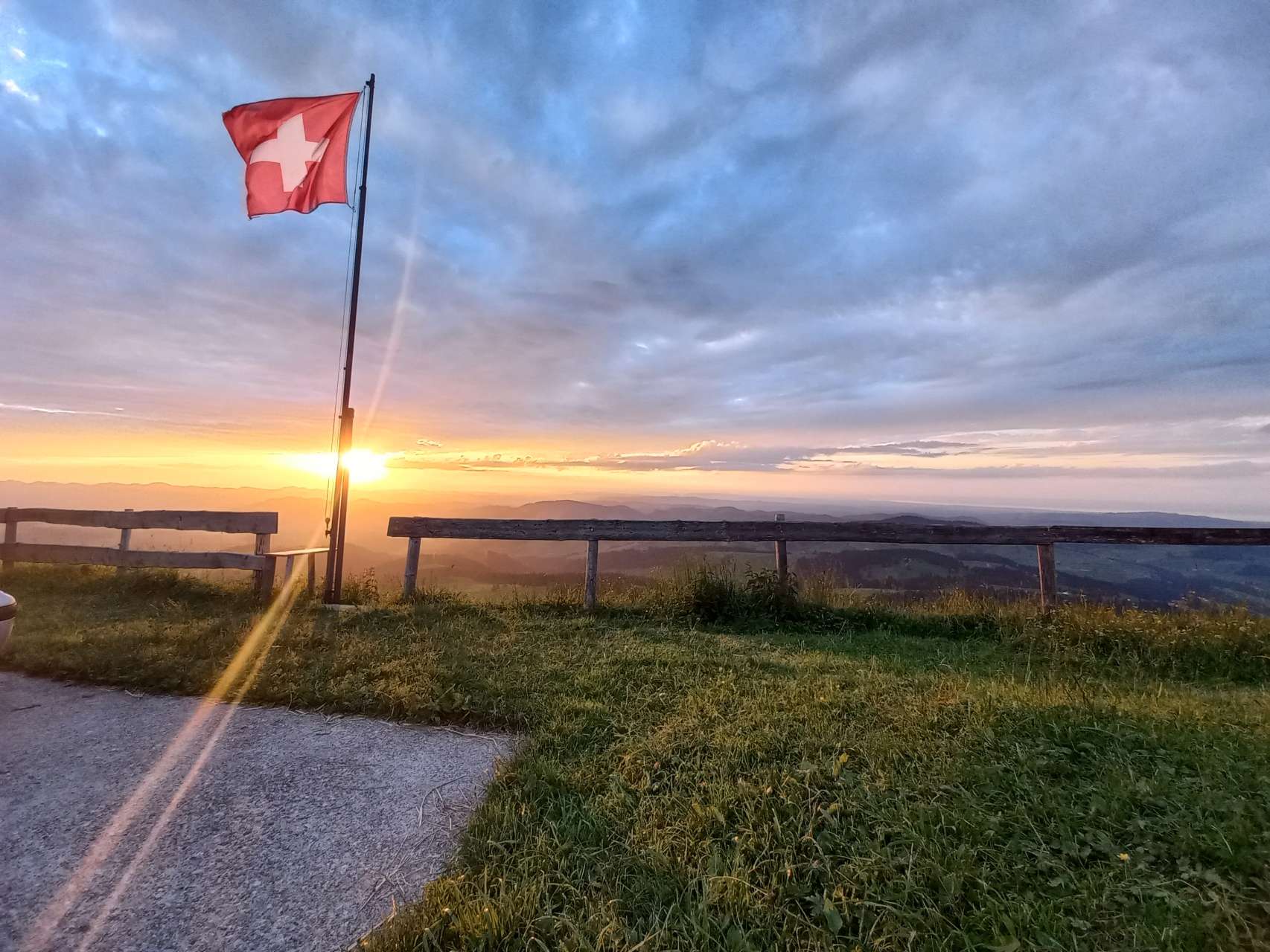 Easy at first before gradually becoming steeper, the ascent starts at Bruggerenwald Süd car park and leads up to the Rossmoos. Cross Rötelbach stream and walk up the tarmac road towards Alp Nasen. After the last bend, a spellbinding view opens up in front of you. The Swiss flag of the Hochalp mountain inn beckons from afar. The view from the highest point at 1,530 m above sea level has to be earned – and once you’ve arrived, you won’t be able to get enough of it, as you gaze out over the Säntis massif, the Churfirsten and the Glarus Alps. Benches and tables invite you to linger outside. Inside, the cosy mountain inn is reminiscent of a bygone era. The menu is authentic and the sausage and salsiz are home-made by the host himself. After recharging your batteries, head downhill on the same path, still on the Rossmoos, and follow the tarmac road back to the starting point at Bruggerenwald car park.