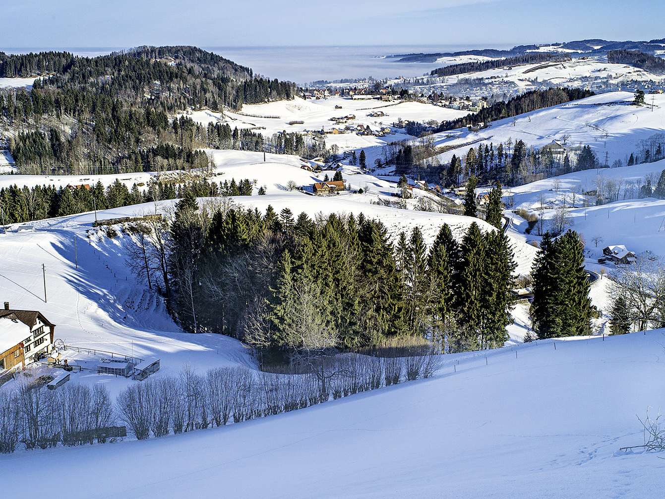 Explore the region around the village of Schwellbrunn on silent, supersized soles along three routes approved by the Swiss snowshoe association (Schneeschuhverband Schweiz, SVS). They all boast fantastic views of the area and most of them are also accessible in spring, summer and autumn since they mostly lead along official hiking trails. Snow-shoers move at a height of 800 to 1,000 metres above sea level, so fog is rarely an issue. The trails start in Schwellbrunn and there is plenty to discover in this historic village of national significance with its many beautiful houses. The age-old cultural customs and traditions are part of the identity of the people living here. Agriculture is in evidence everywhere, and the hills and valleys are dotted with farmsteads.