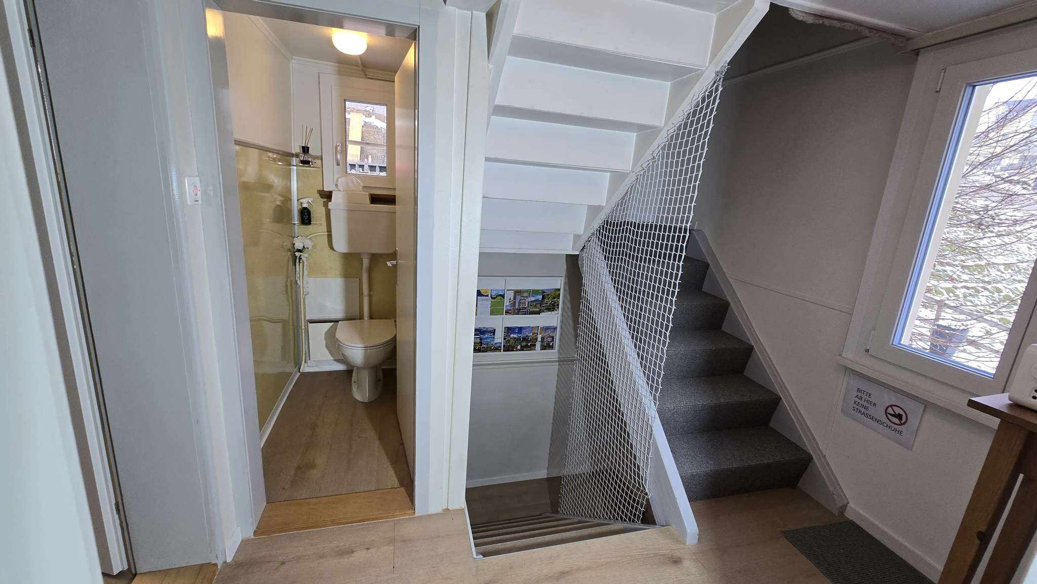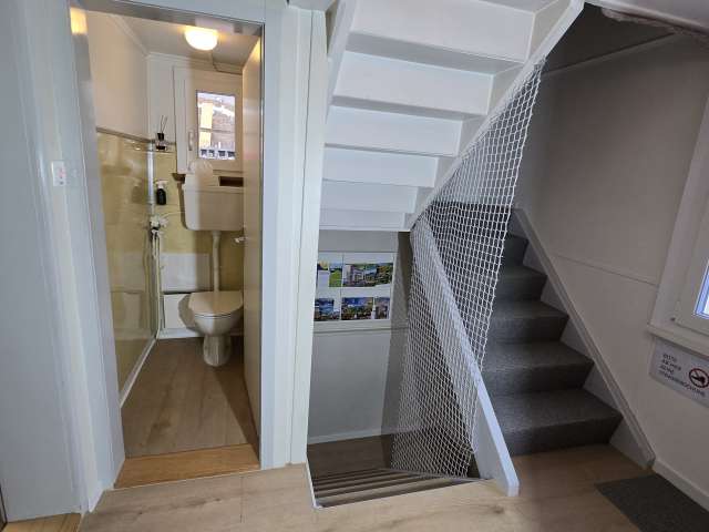 On a south-facing slope, this detached, two-storey house is roughly 100 years old. It underwent a minor renovation in 2021/2022, with new organic vinyl floors installed throughout, parquet flooring in the living room, mostly new windows and brightly furnished rooms. Rooms in the first-floor living and sleeping area have a ceiling height of 2 m, and 1.90 m in the second-floor sleeping area. Two separate parking spaces are available for guests’ exclusive use.