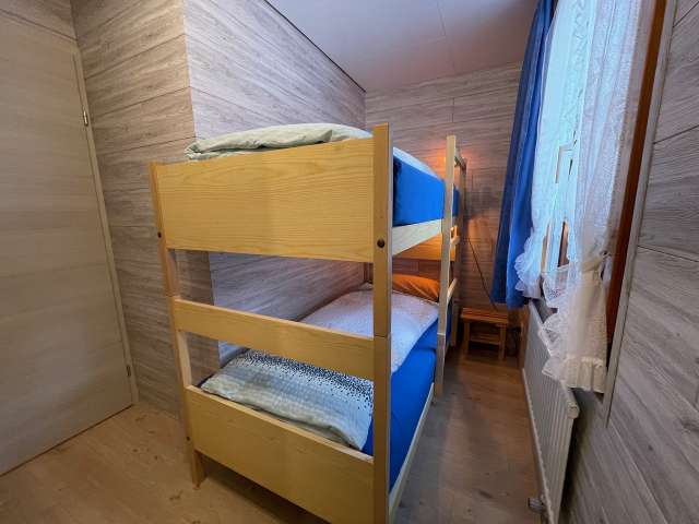 Ideally suited for families, pensioners or business travellers. Situated at the edge of the village, the holiday apartment has a separate entrance accessed via the winding stairs to the basement. There, you enter the spacious entrance hall. The modern, open-plan kitchen with dishwasher adjoins the living room, with sliding doors giving onto a large balcony. The shower room features a shower, toilet and washbasin. A choice of three bedrooms is available: one parents’ bedroom with two 90-cm-wide mattresses, one bedroom with a 160-cm-wide bed and en suite shower room (toilet, washbasin and shower) as well as a smaller children's room with bunkbed and 2 190 x 80 cm mattresses. Guests can play and relax on the lawn one storey below the apartment. A washing machine and tumble dryer are also available.