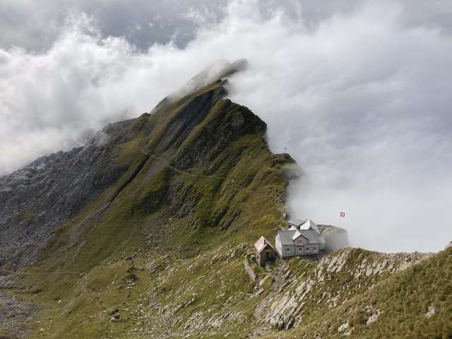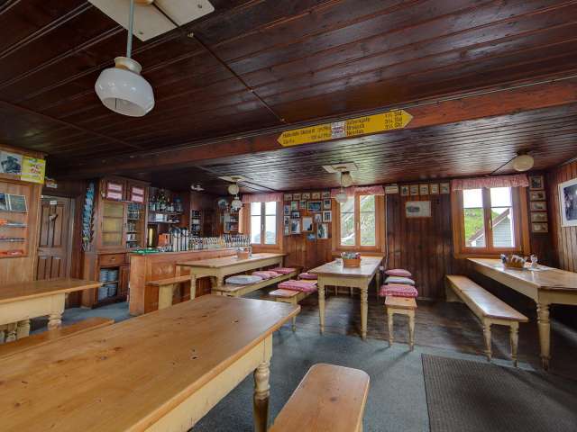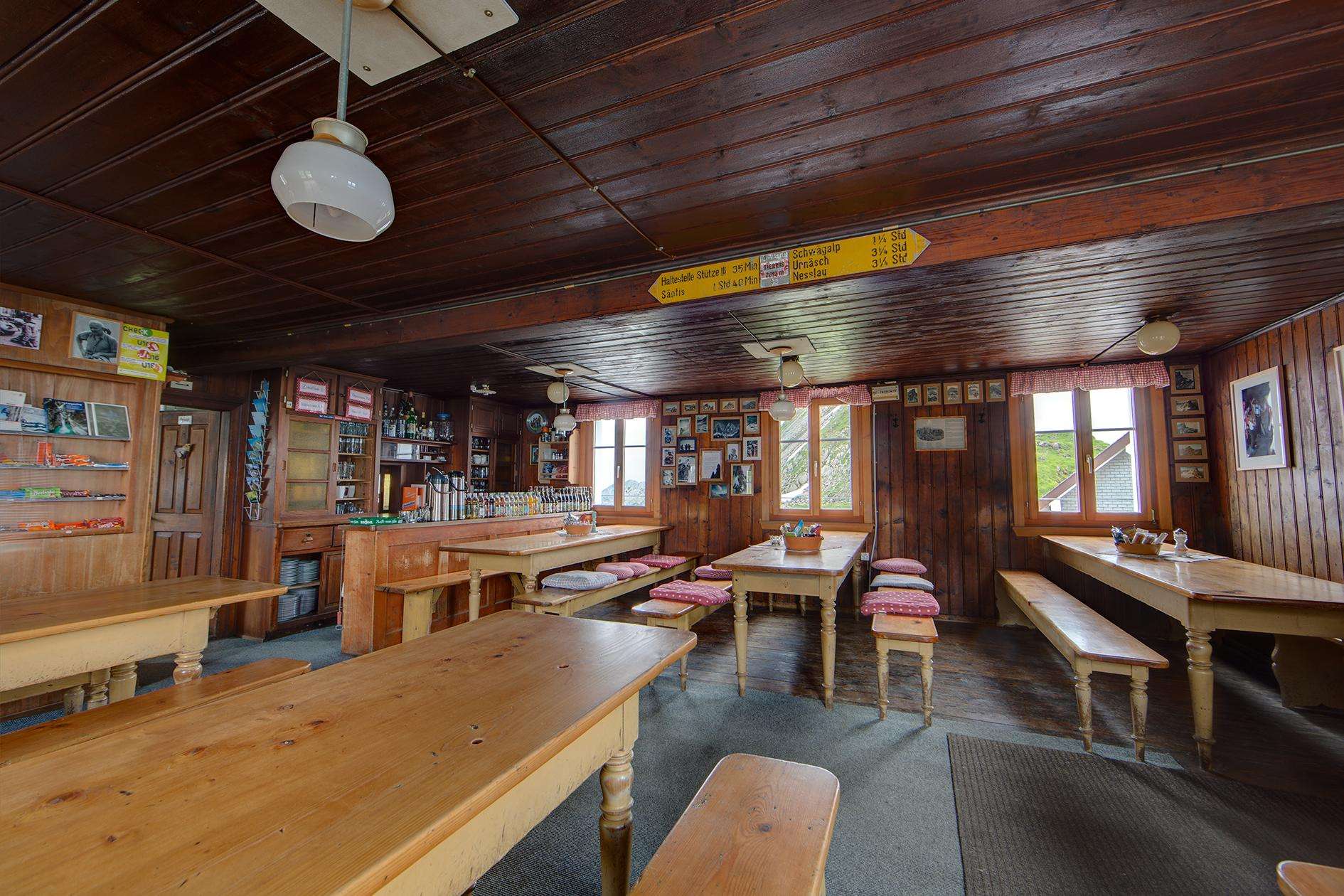 The mountain inn is situated at 2,085 metres above sea level and boasts spectacular views of the surrounding mountains. To the north, the view meanders across the soft hills of the Appenzellerland as far as southern Germany, and looking south, visitors can see the summits of the Alps. The restaurant can seat around 60 people. On a sunny day, another 40 can sit outside, and a total of 50 beds are available for guests who want to stay overnight.