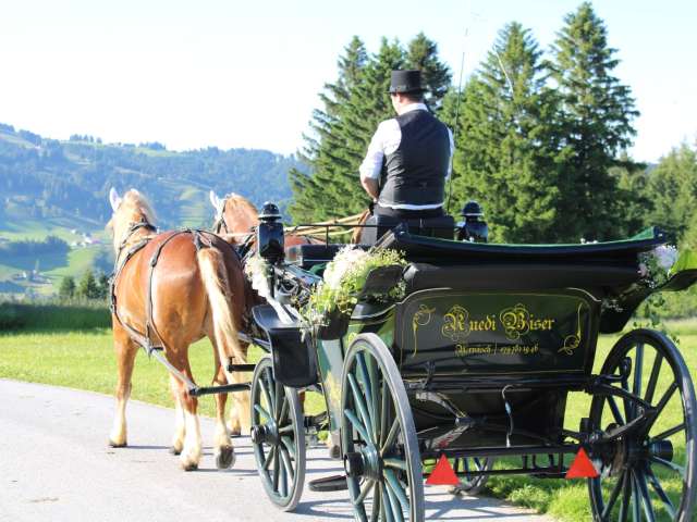 Avec la calèche de mariage (landau) et son attelage joliment décorés, vous serez parfaitement parés pour votre journée spéciale – votre mariage sera inoubliable!