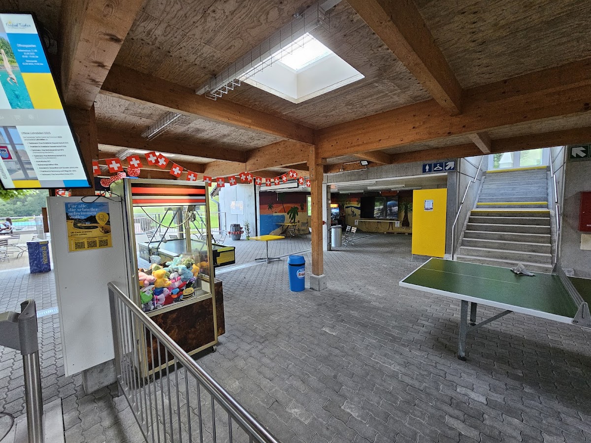 La piscine de plein air de Teufen offre tout ce dont rêvent les amateurs de baignade: un bassin sportif de 50 mètres, un bassin non-nageurs de 25 mètres, une pataugeoire, un toboggan à ruissellement, un terrain de beach-volley, un espace barbecue et bien d’autres choses encore.
