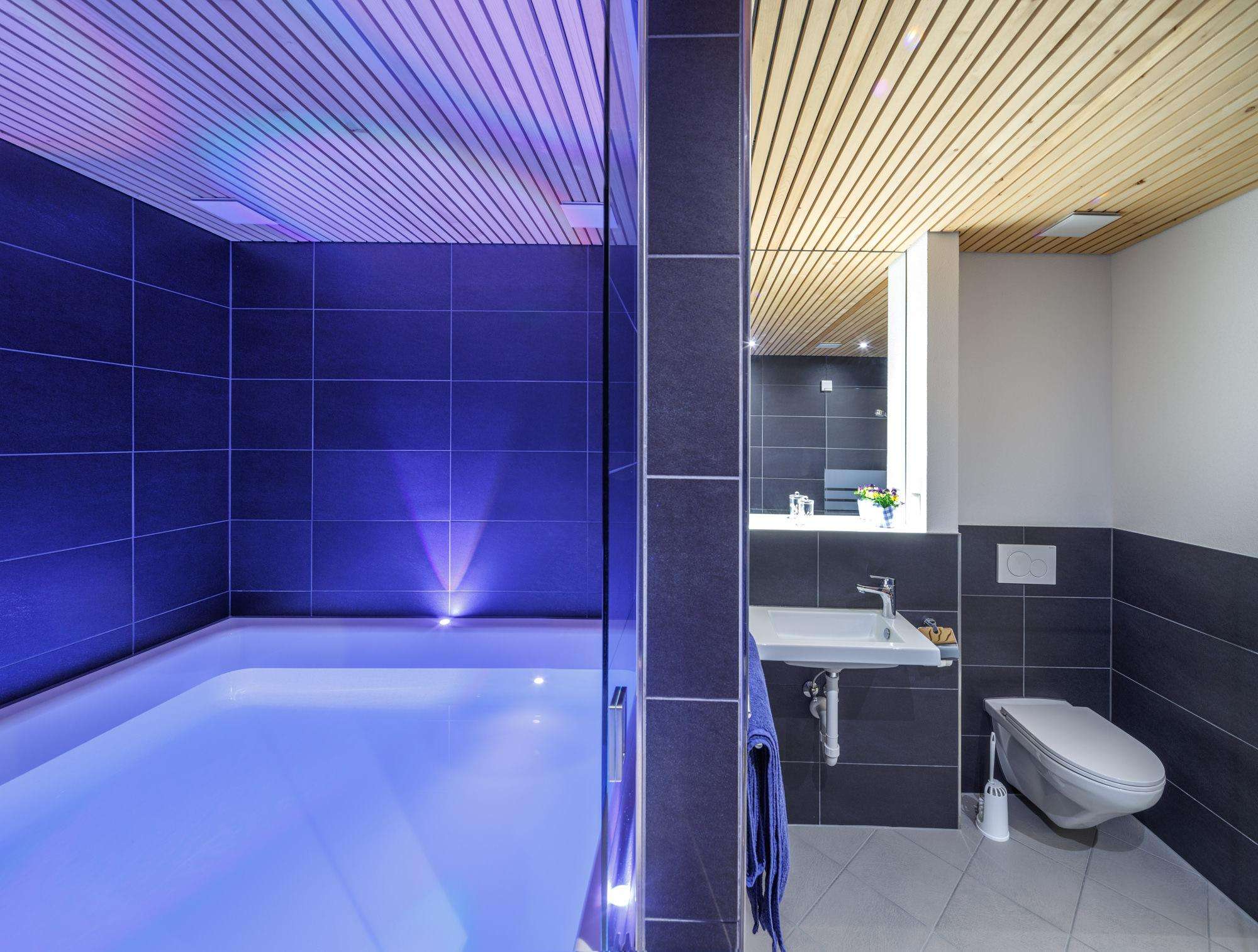 Le FloatingOase à Bühler dispose de deux flotariums individuels (largeur 170 cm, longueur 230 cm, profondeur 47 cm, support d’eau salée 30 cm env.), à usage individuel ou double sur réservation. Chaque unité dispose d’un petit vestiaire, de WC, d’une douche et, naturellement, d’un grand bassin. Ce dernier est vidé après chaque baignade, l’eau salée est acheminée à travers une installation de nettoyage à plusieurs étages et la zone de baignade toute entière est nettoyée.