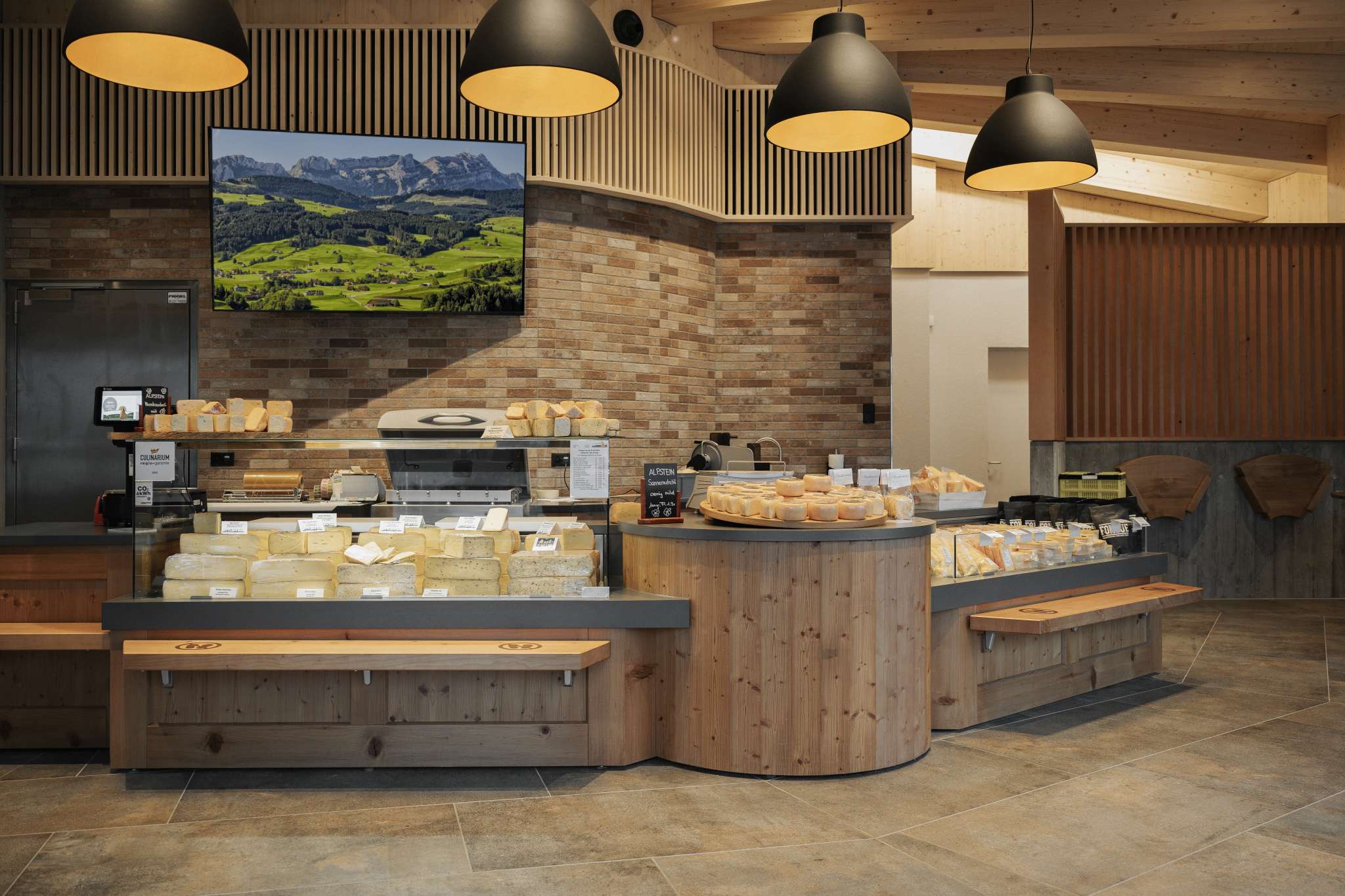 La fromagerie de montagne emploie, selon la saison, jusqu’à douze collaborateurs et transforme chaque jour 50 000 à 60 000 kilos de lait de montagne appenzellois en différentes spécialités de fromage de montagne et demi-dur ainsi qu’en fromage à raclette.