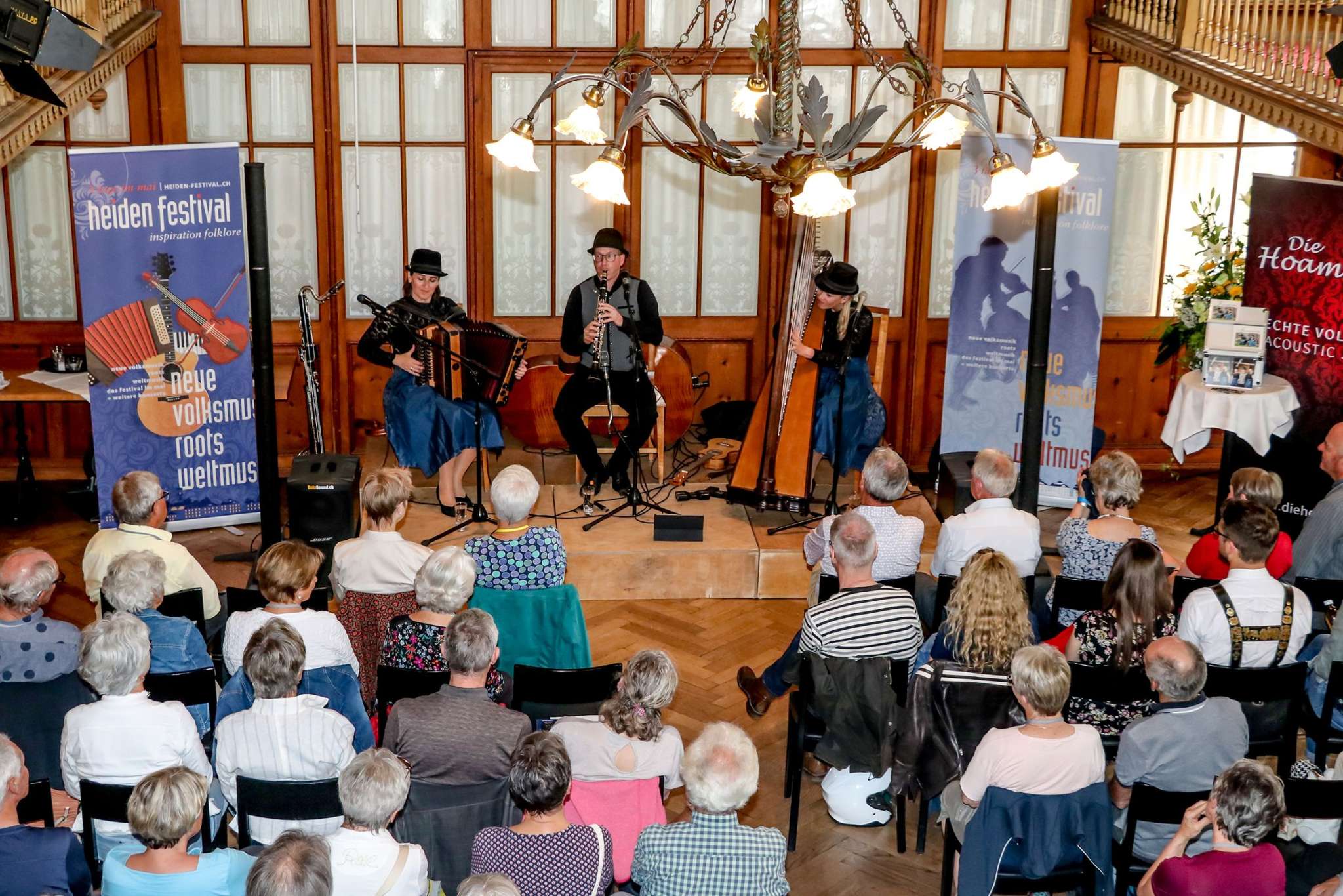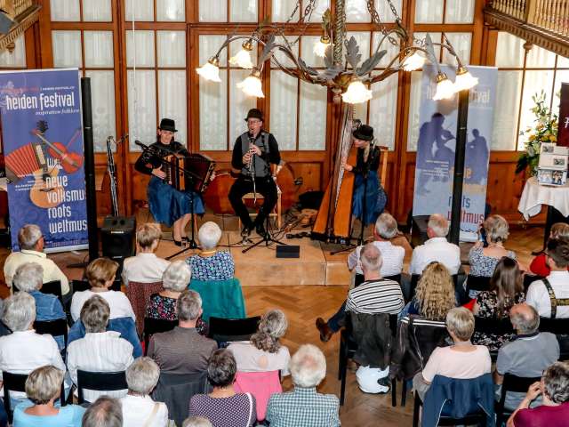 Le « heiden festival » ne cesse d'affiner le programme folklorique avec des sonorités créatives, jazz et classiques ainsi que d'autres surprises passionnantes. Pour l'édition 2025, on a par exemple pu engager pour le vendredi « Oesch's die Dritten », quadruple vainqueur du Prix Walo et fier détenteur de diverses autres distinctions. Le samedi après-midi, « Säntis Barock und Bismärklis » présenteront dans l'église protestante un mélange intéressant de chansons françaises de l'époque baroque et de musique de yodel du pays d'Appenzell. Le soir, le Kursaal accueillera « Thomas Gansch und Alpenglühn », un supergroupe d'excellents musiciens autrichiens. Le dimanche, le festival se terminera en apothéose avec le groupe « Ueli Schmezer's MatterLive », qui fera revivre les chansons du légendaire chanteur suisse dans une salle du Lindensaal probablement pleine à craquer.