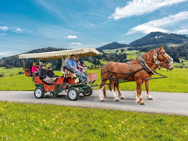 En hiver, un traîneau accueillant jusqu’à 6 personnes est proposé; en été, ceux qui le souhaitent peuvent disposer d’une calèche «familiale» d’une capacité allant jusqu’à 10 personnes.