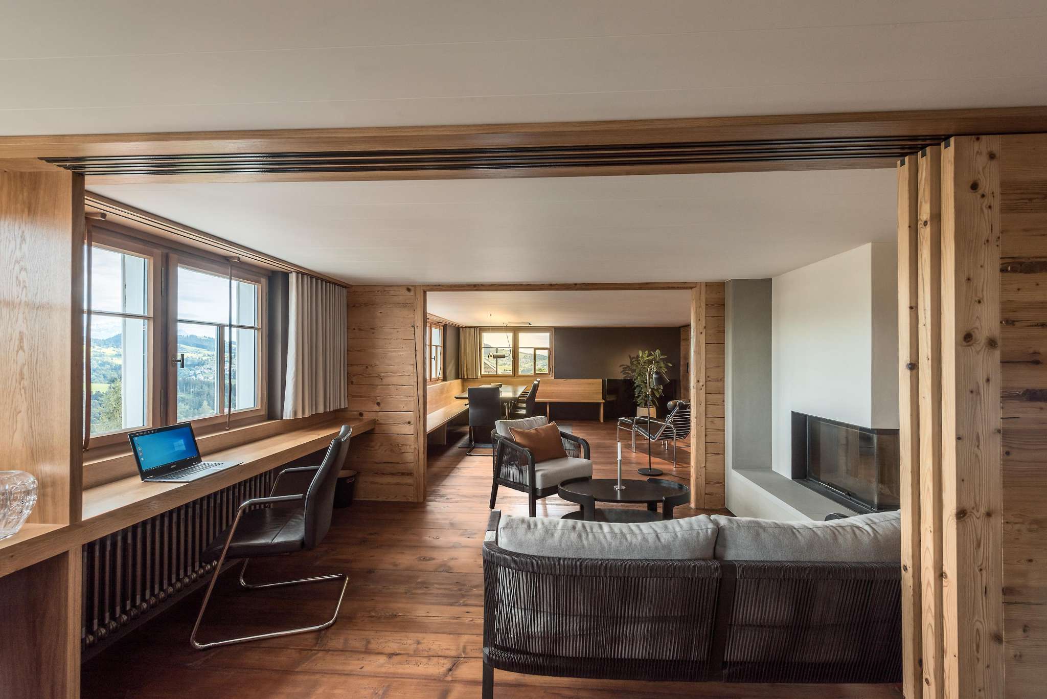 Dans cette maison classée monument historique, rénovée avec goût et située sur la place historique du village de Rehetobel, l’ancien côtoie le moderne.