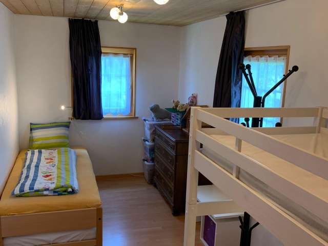 L'appartement confortable offre une cuisine moderne, un salon et deux chambres à coucher. Un jardin spacieux avec beaucoup de soleil, des arbres fruitiers ombragés et une vue magnifique invite à la détente. D'innombrables sentiers de randonnée attendent d'être découverts. Dans la forêt voisine, un tipi (avec foyer) invite également les enfants à s'amuser et à vivre des aventures.