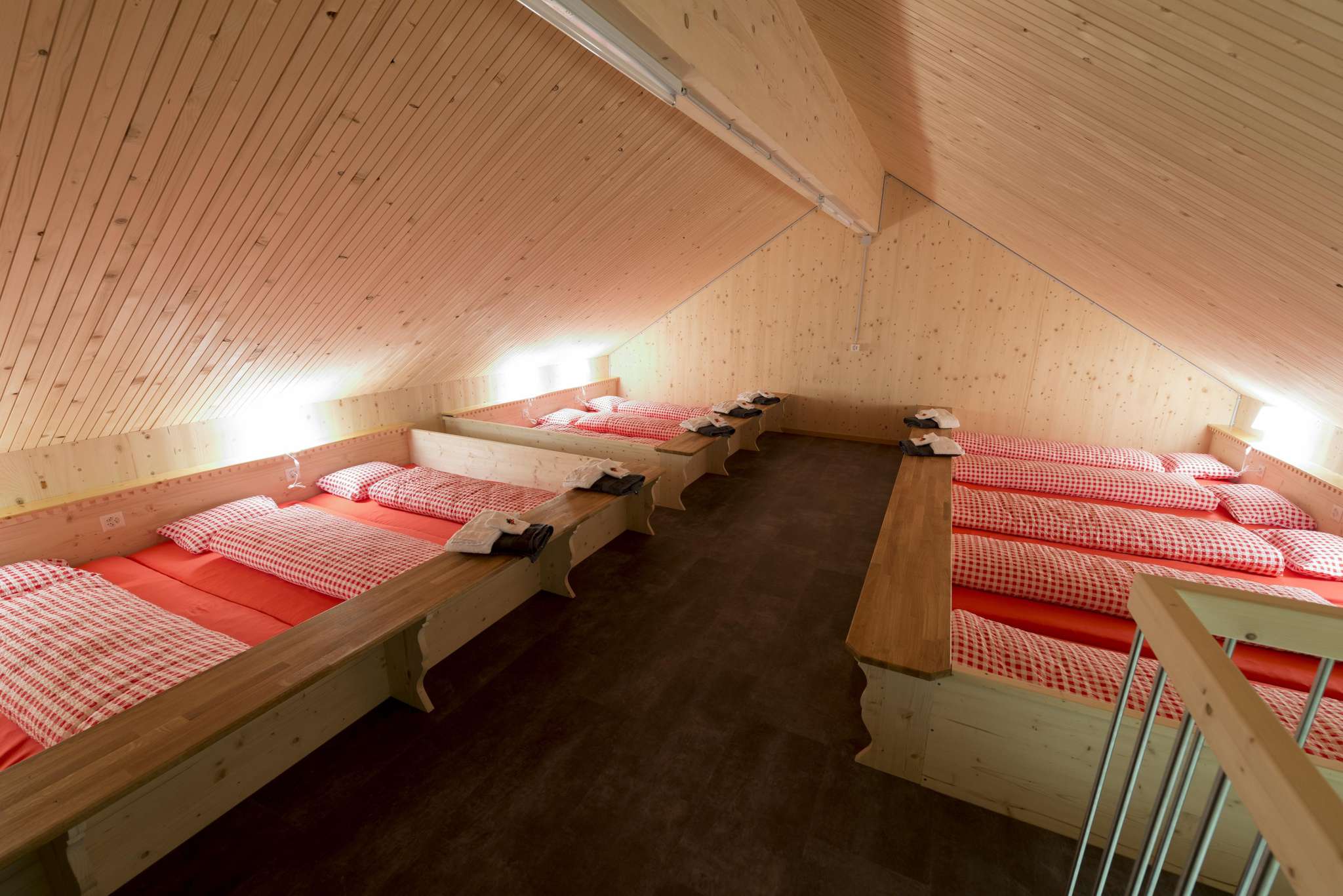 Le dortoir offre une capacité de 12 couchages. Tous les lits sont équipés de duvets. Au rez-de-chaussée se trouve une douche avec WC. Un réfrigérateur avec un petit choix de boissons est à la disposition des clients. Un buffet en bois traditionnel et un coin salon complètent l’offre d’hébergement.