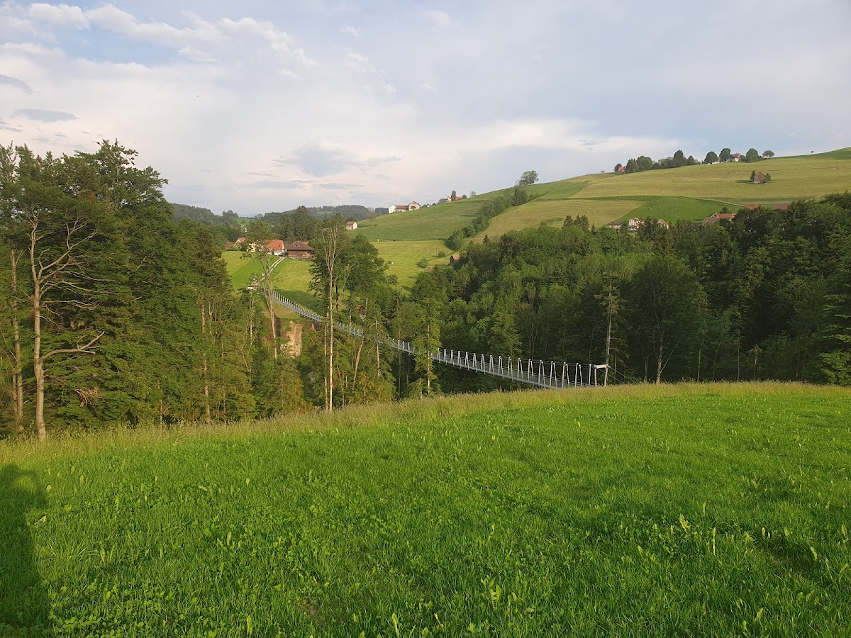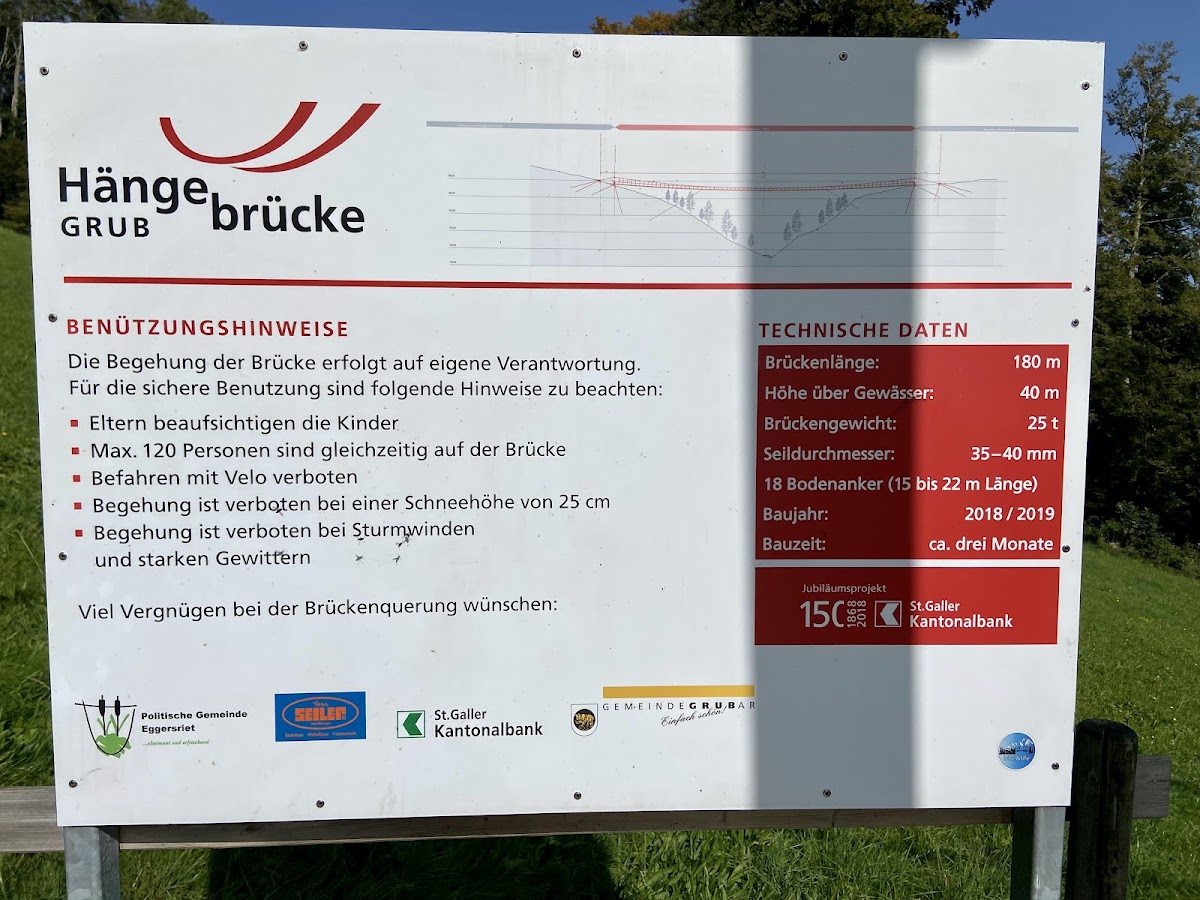 Depuis avril 2019, les deux villages de Grub AR et Grub SG sont à nouveau reliés entre eux par un magnifique pont suspendu de 180 mètres de long au-dessus du Mattenbach. Un sentier de randonnée très apprécié au-delà de la frontière cantonale, qui relie Frauenrüti Grub AR au territoire de Grünau Grub SG, se trouve ainsi à nouveau accessible.